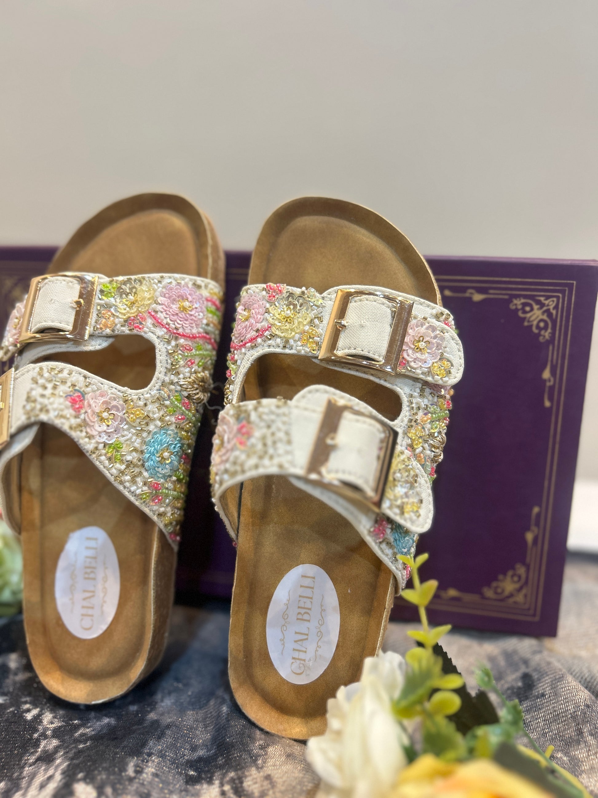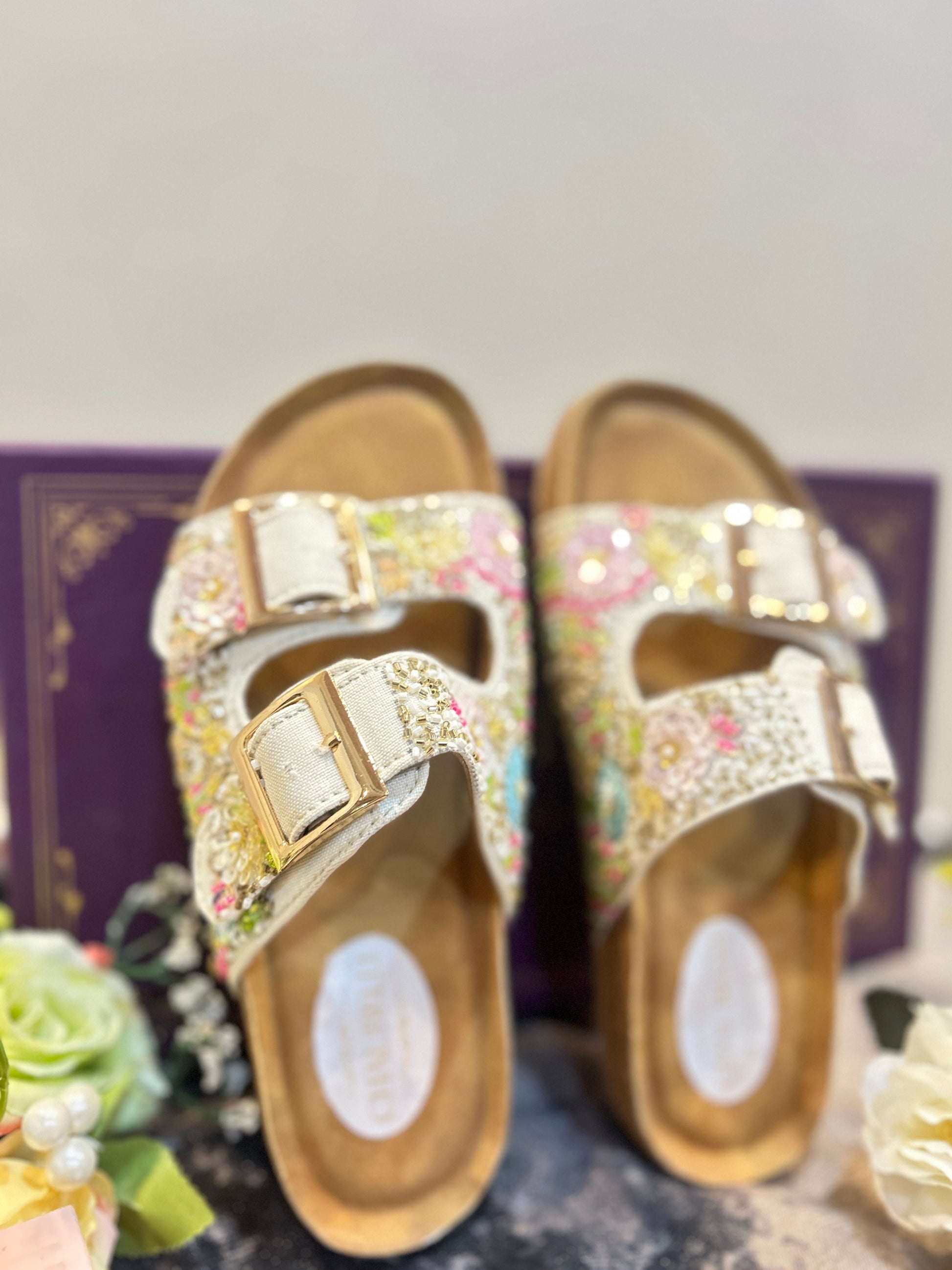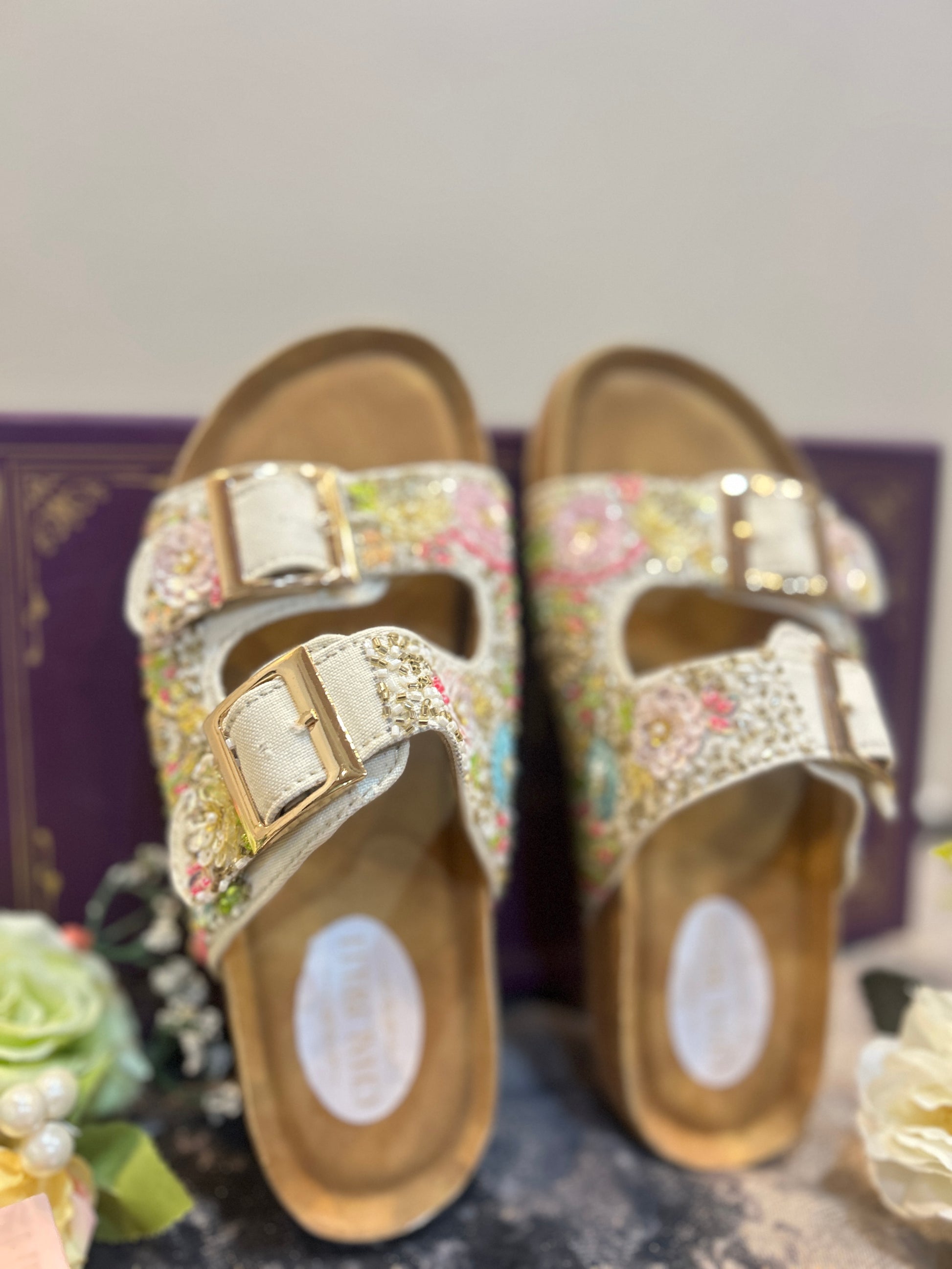The Artisan Groove slide features delicate pastel floral embroidery and a secure double-buckle design. This unique style provides artisanal elegance and cushioned, true-to-size comfort for casual wear.