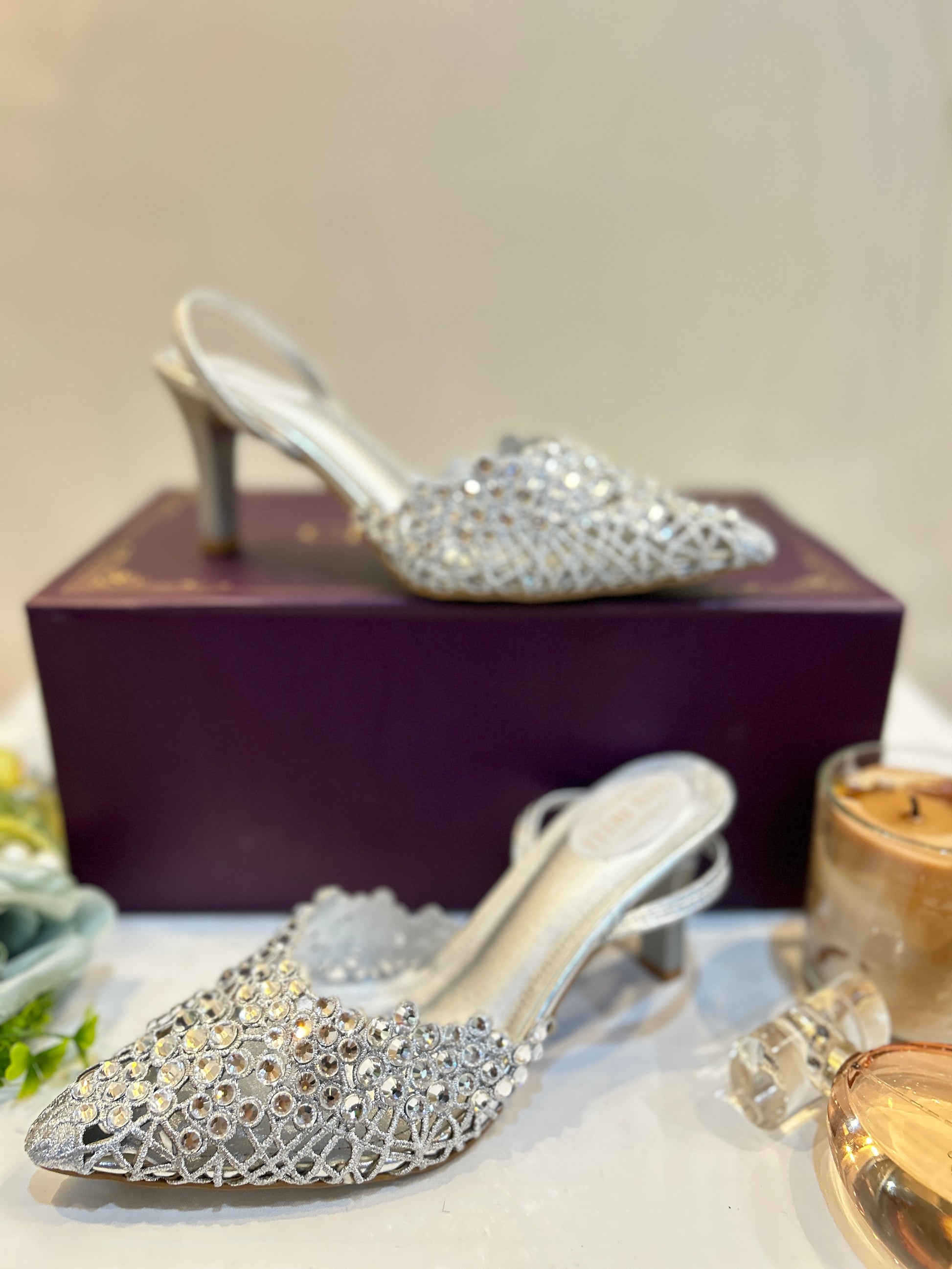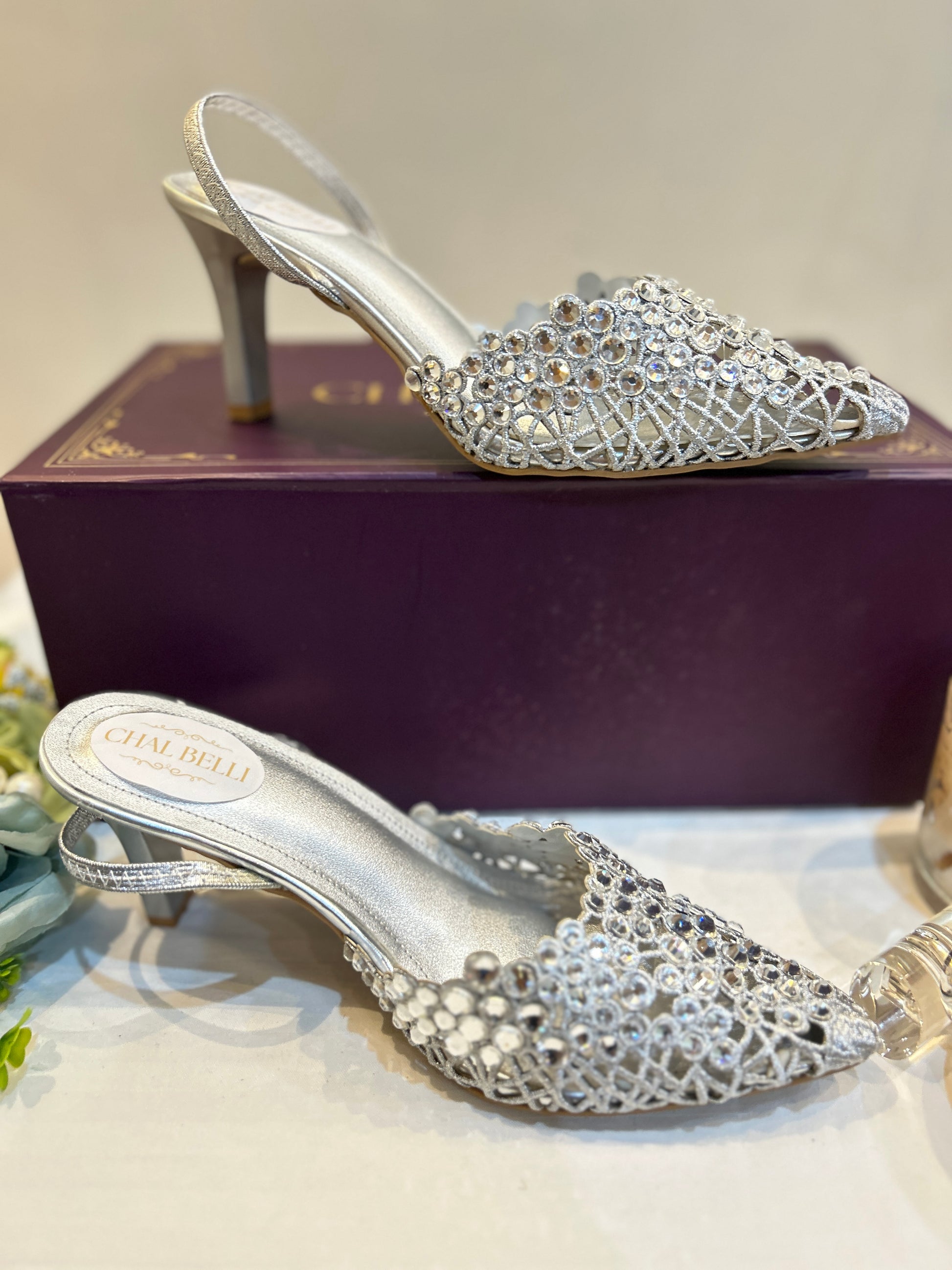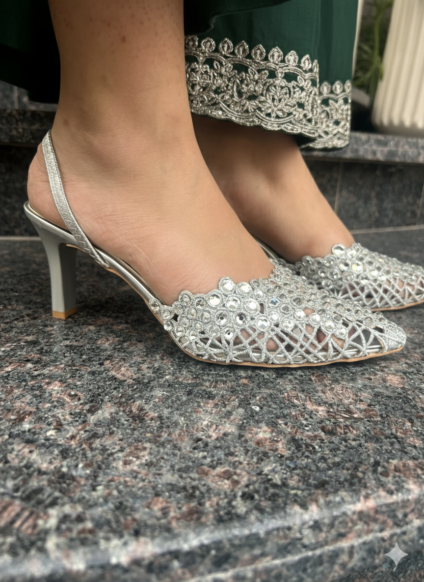 The Aura heel radiates pure elegance, featuring a stunning silver lattice design with scalloped edges on a sleek stiletto. This glamorous, open-mesh heel offers great comfort and a sophisticated finish.