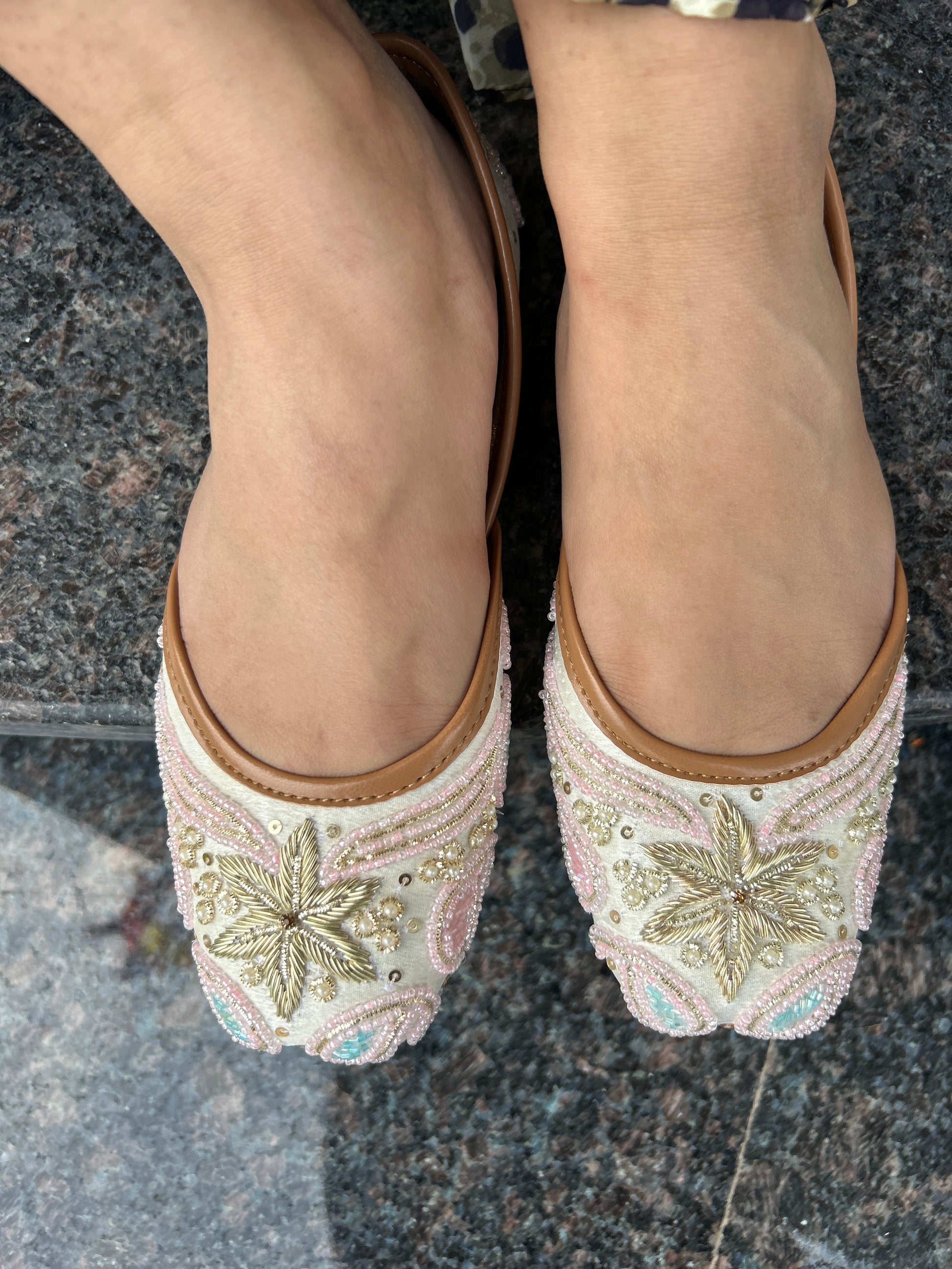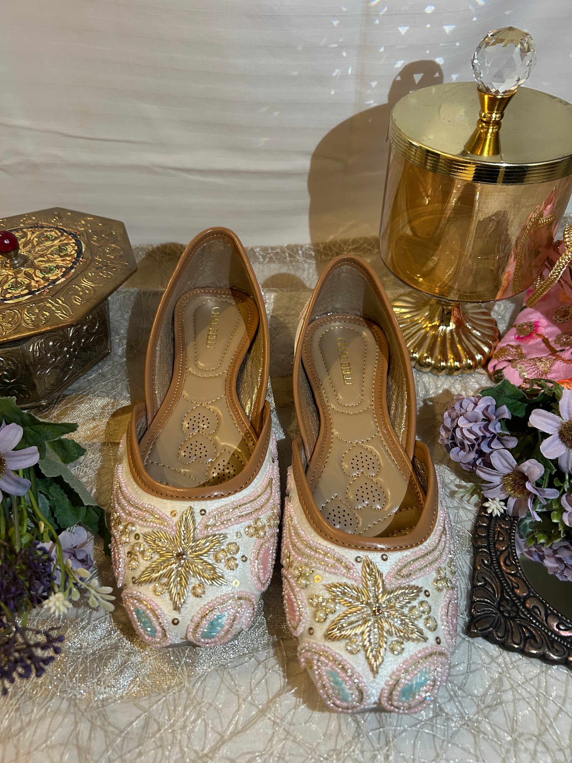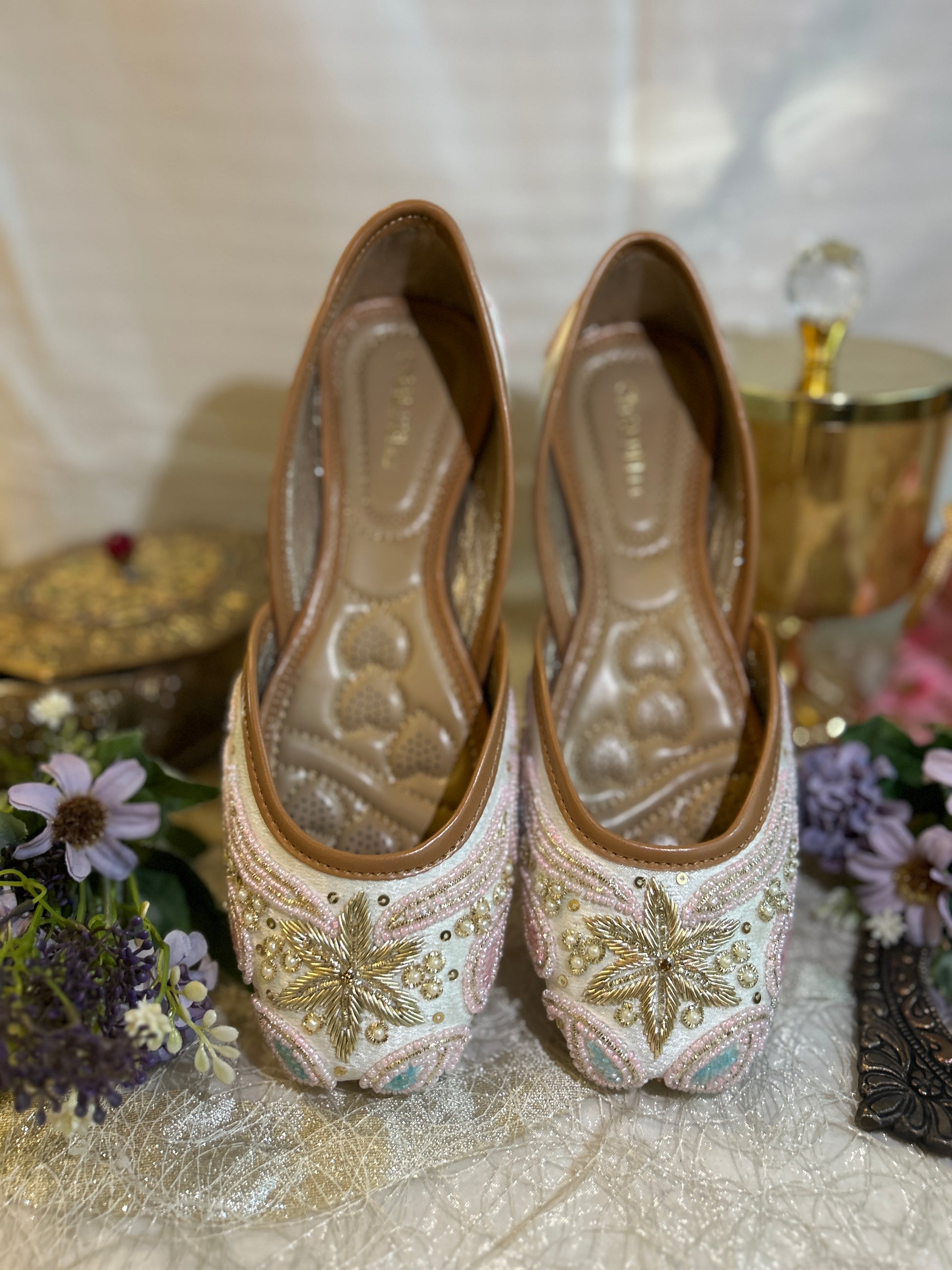 The Chameli jutti features a stunning gold zari star motif surrounded by delicate pink and mint beadwork on a light base. This ethereal design offers sophisticated elegance and great comfort, perfect for special daytime events.