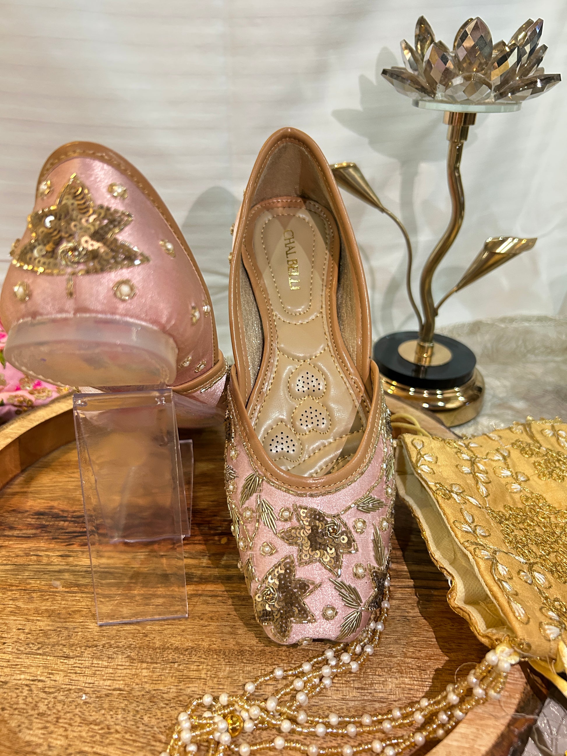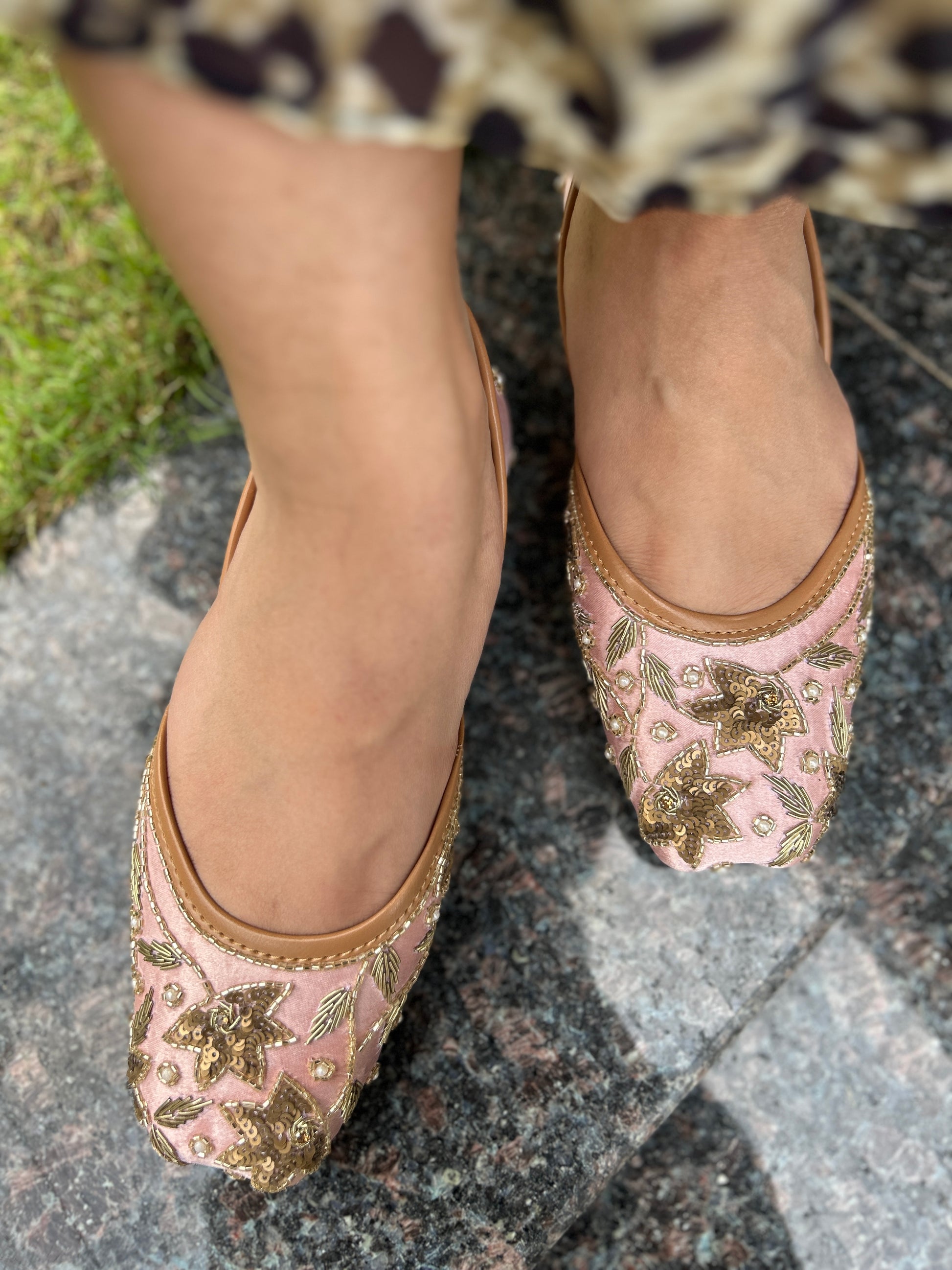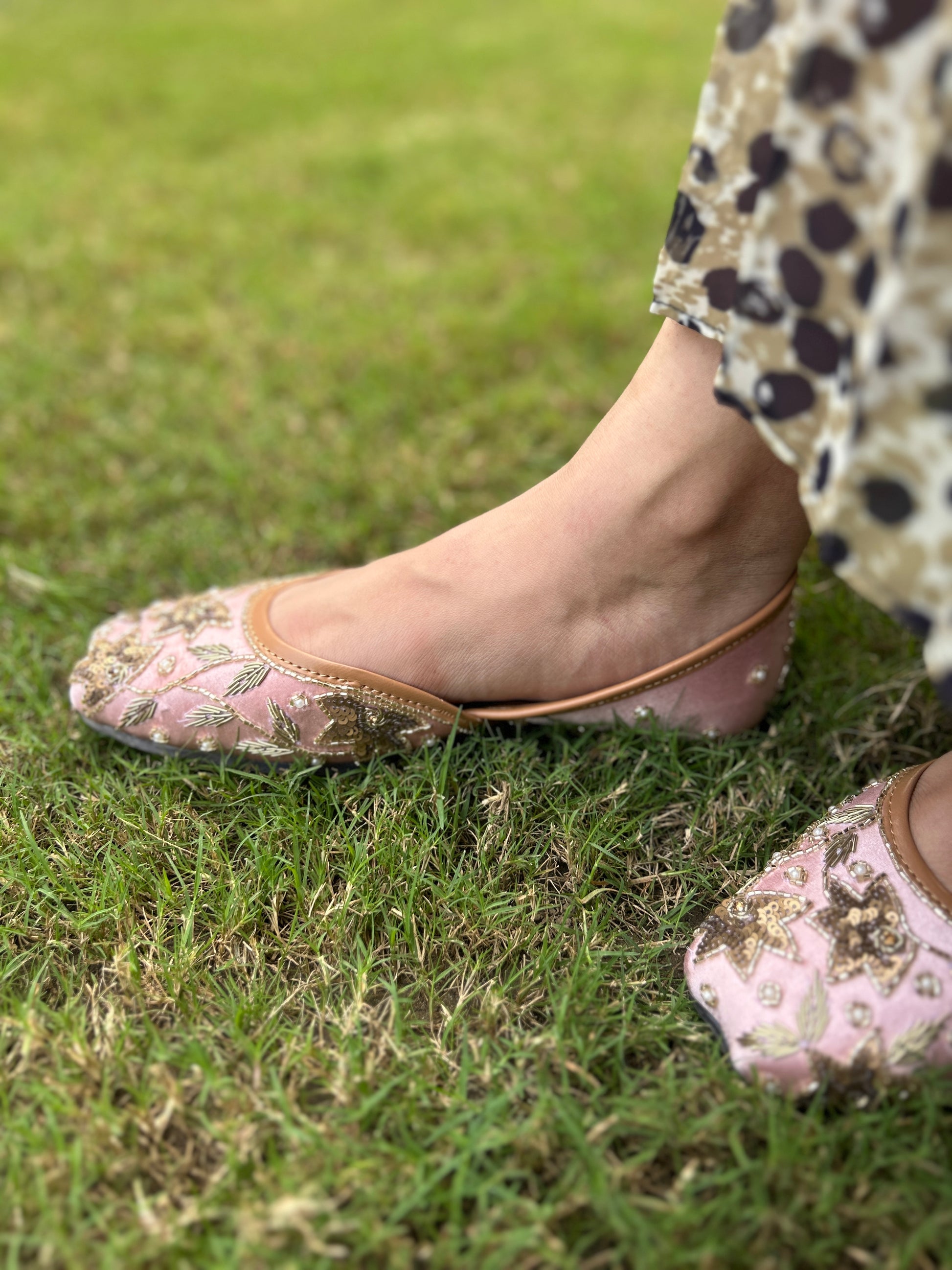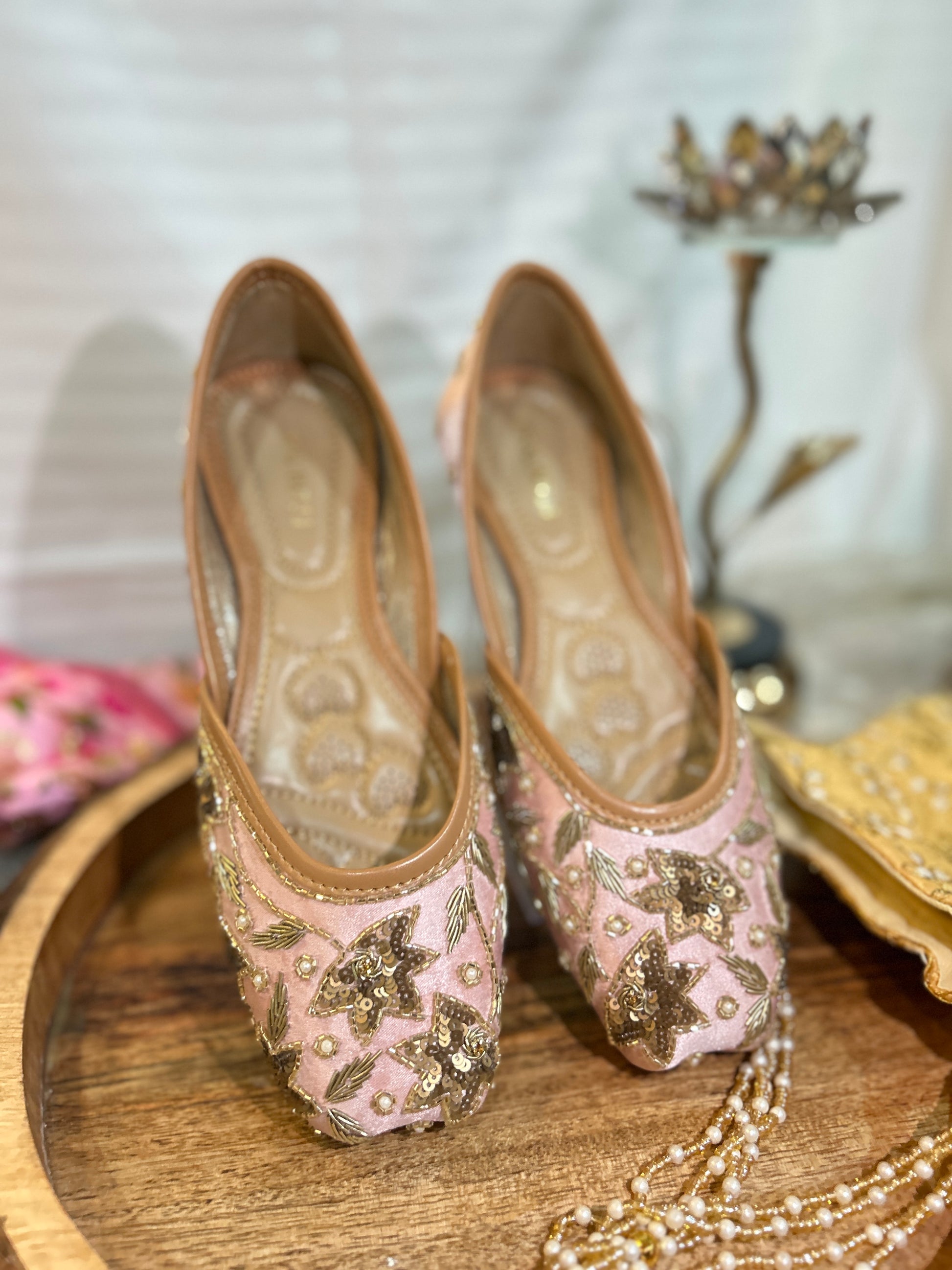 The Chanderi jutti features a soft, dusty pink base adorned with shimmering gold sequin stars and delicate threadwork. This elegant, feminine design is perfect for daytime events, offering great comfort and understated glamour.