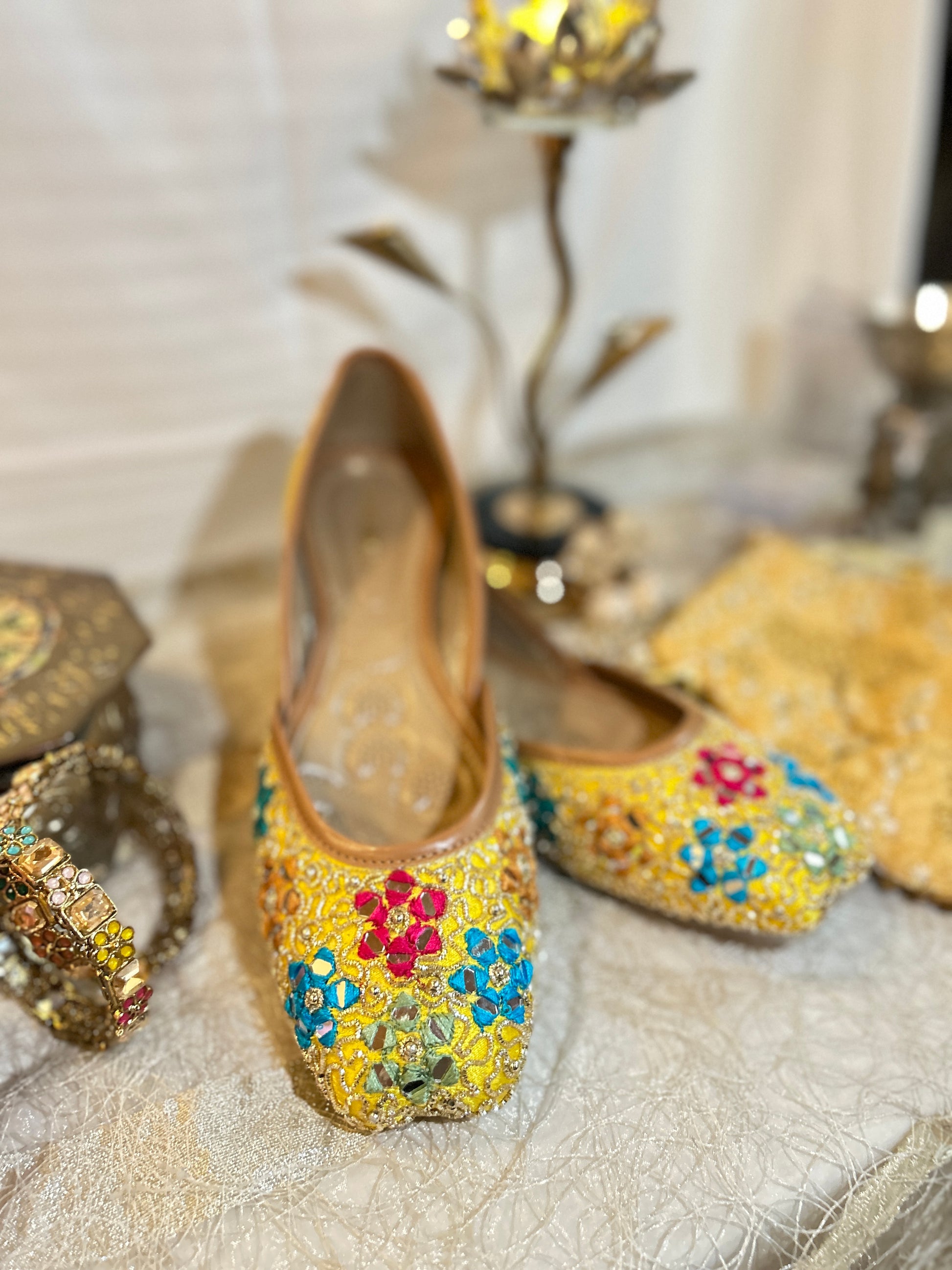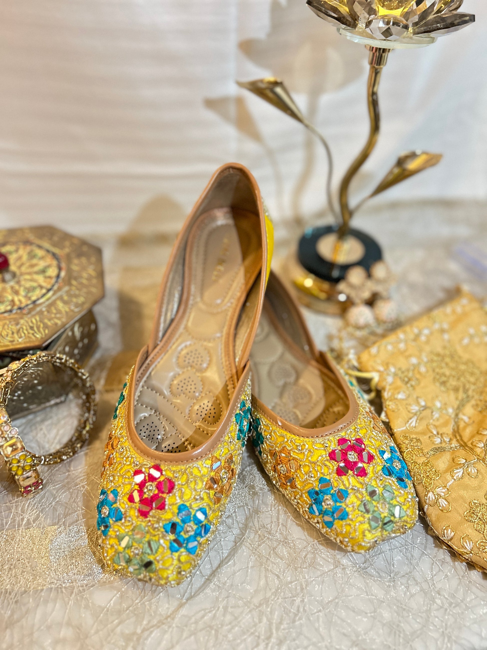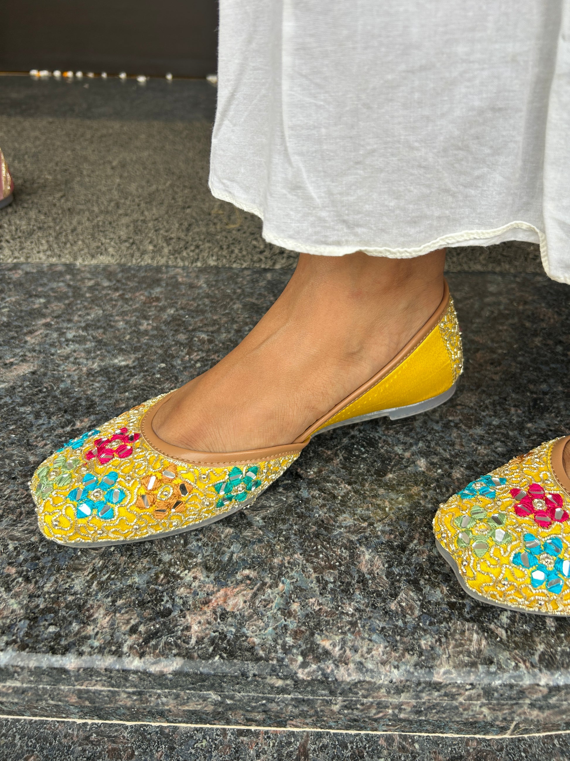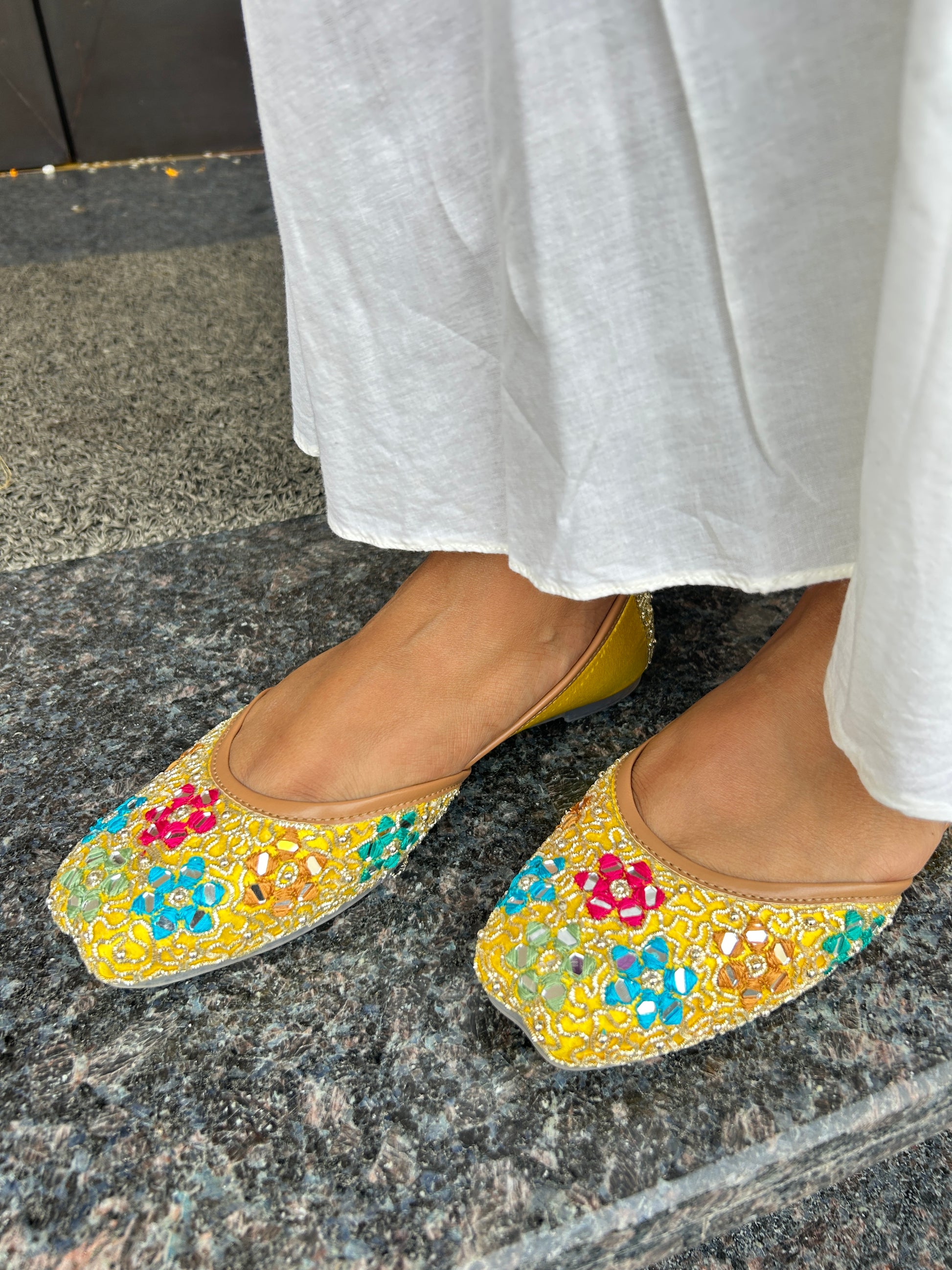 The Genda Phool jutti features a brilliant yellow base adorned with multi-colored floral embroidery and sparkling stones. Its lively, colorful design is perfect for festive wear, offering exceptional comfort all day long.