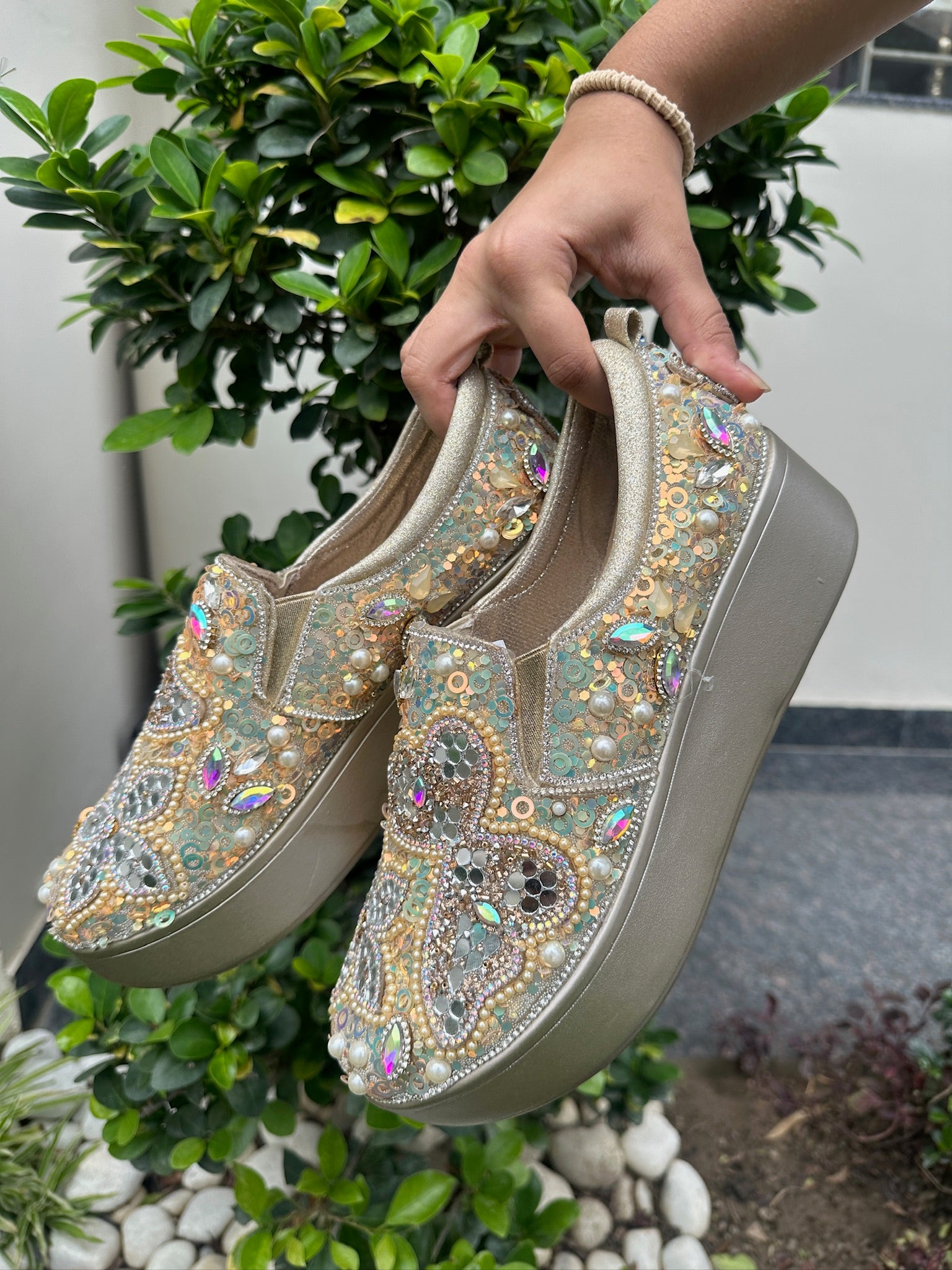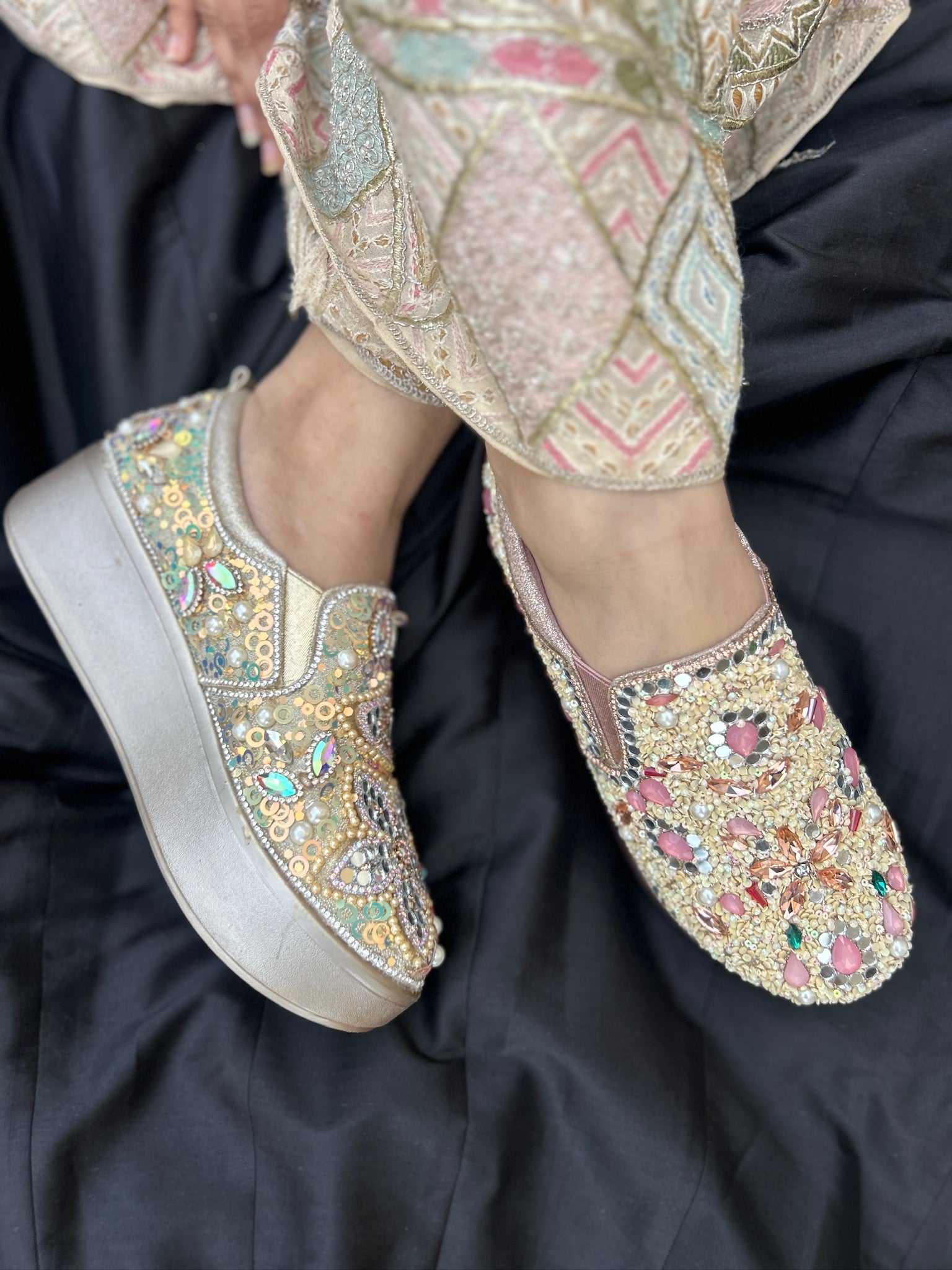 The Gulzar sneaker is a wedding essential, featuring a light base covered in vibrant blue, green, and pink rhinestone clusters. This glamorous slip-on offers maximum style and dance-floor comfort.