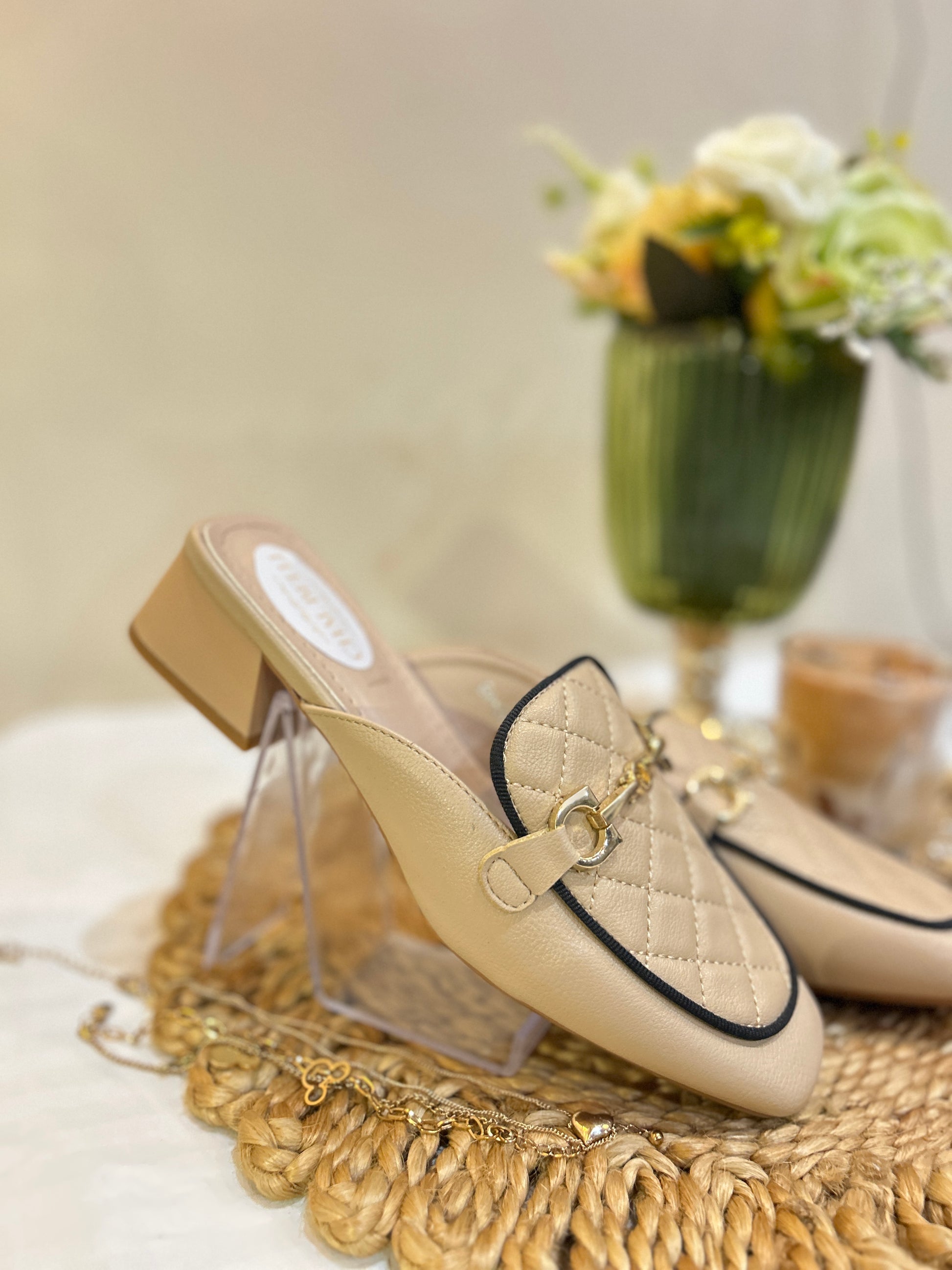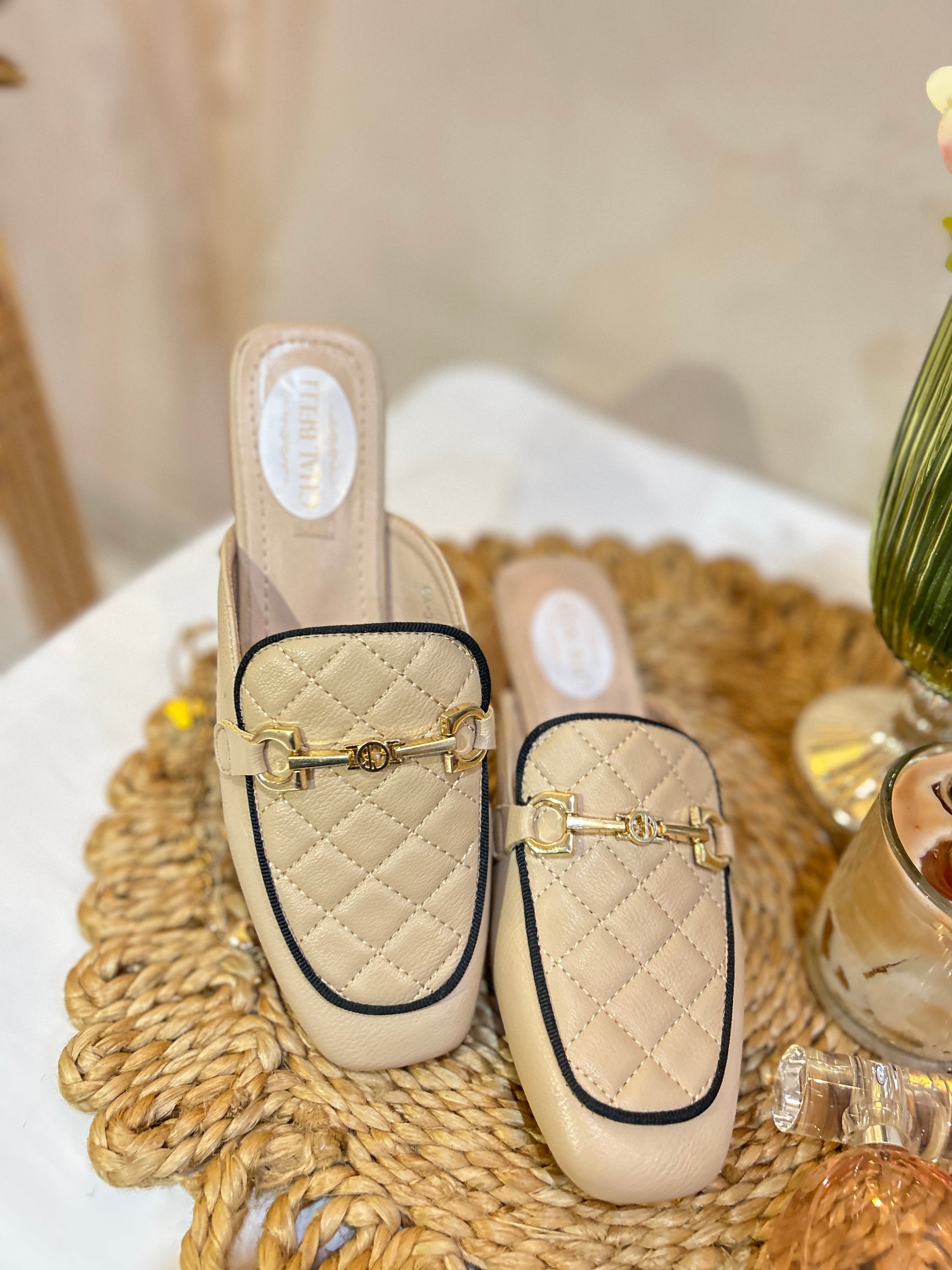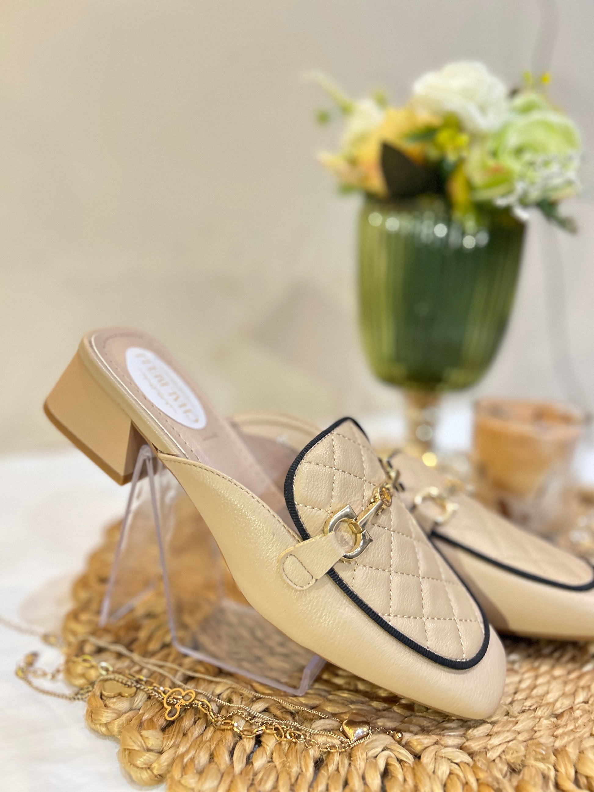 | Design | Quilted (Diamond Textured) Mules with Polished Gold Chain/Bit Buckle |
