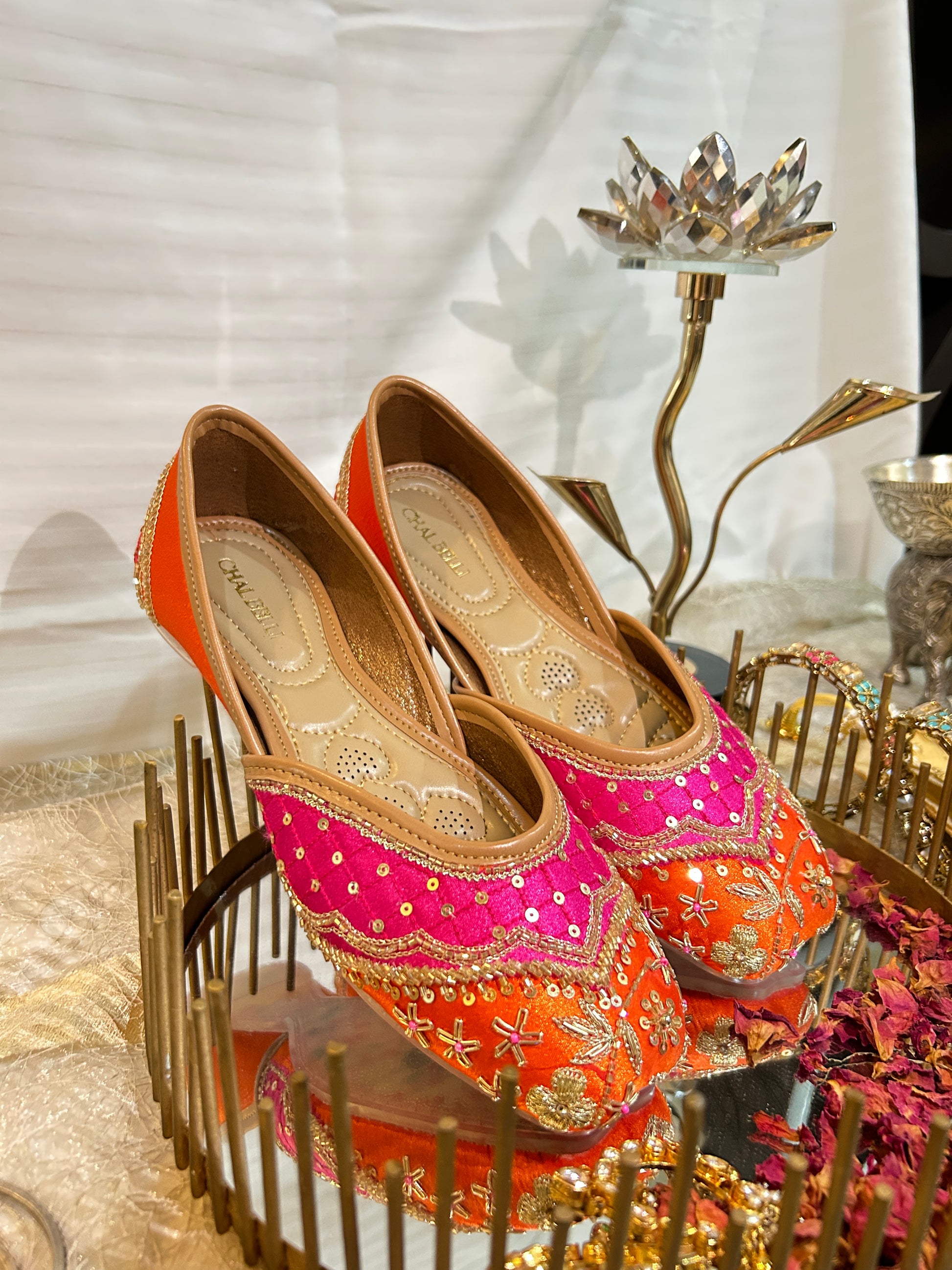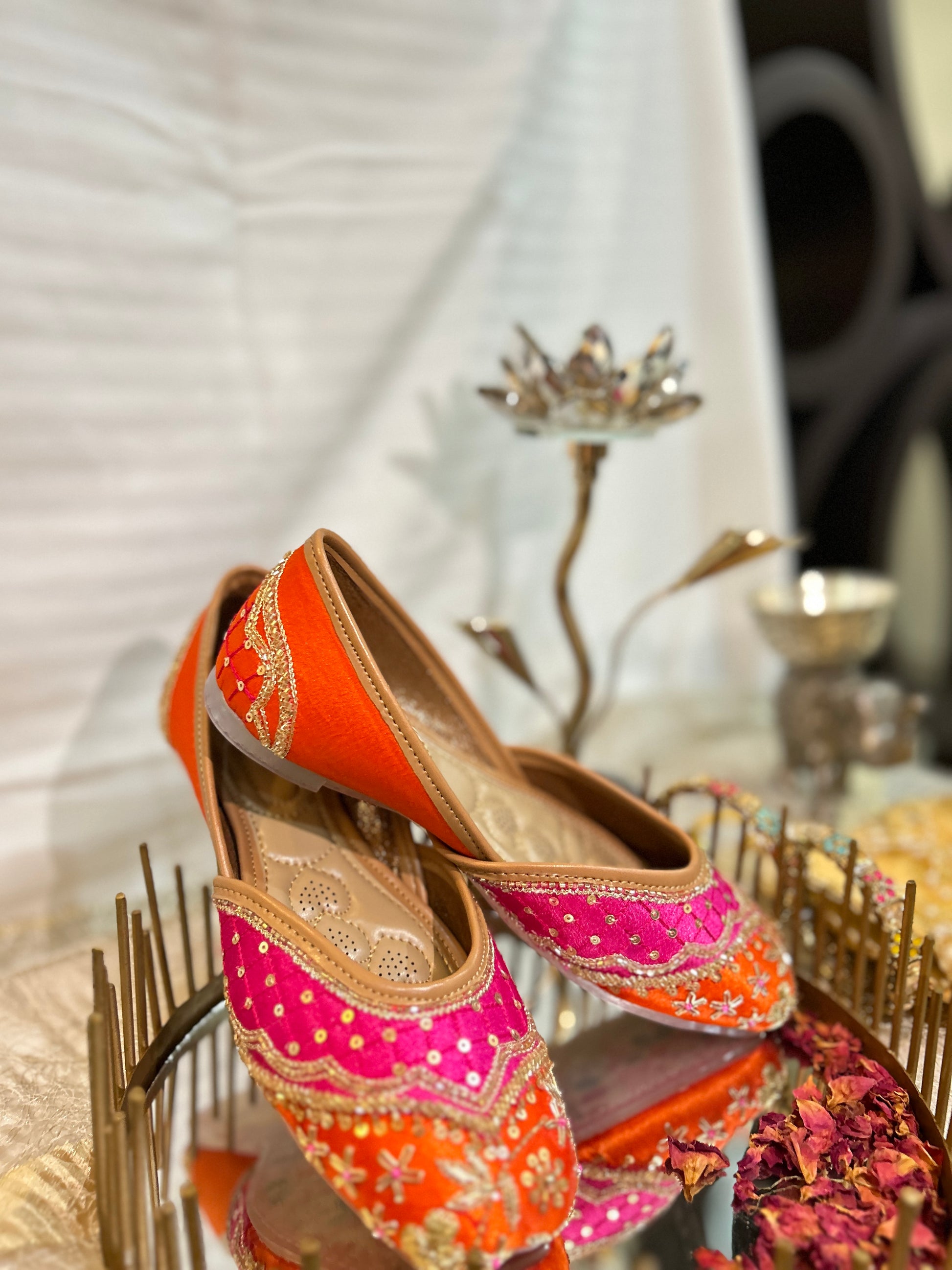 The Mauj jutti is pure festive joy, featuring a striking blend of hot pink and vibrant orange with intricate gold zari and sequin embroidery. This lively design offers comfortable elegance.