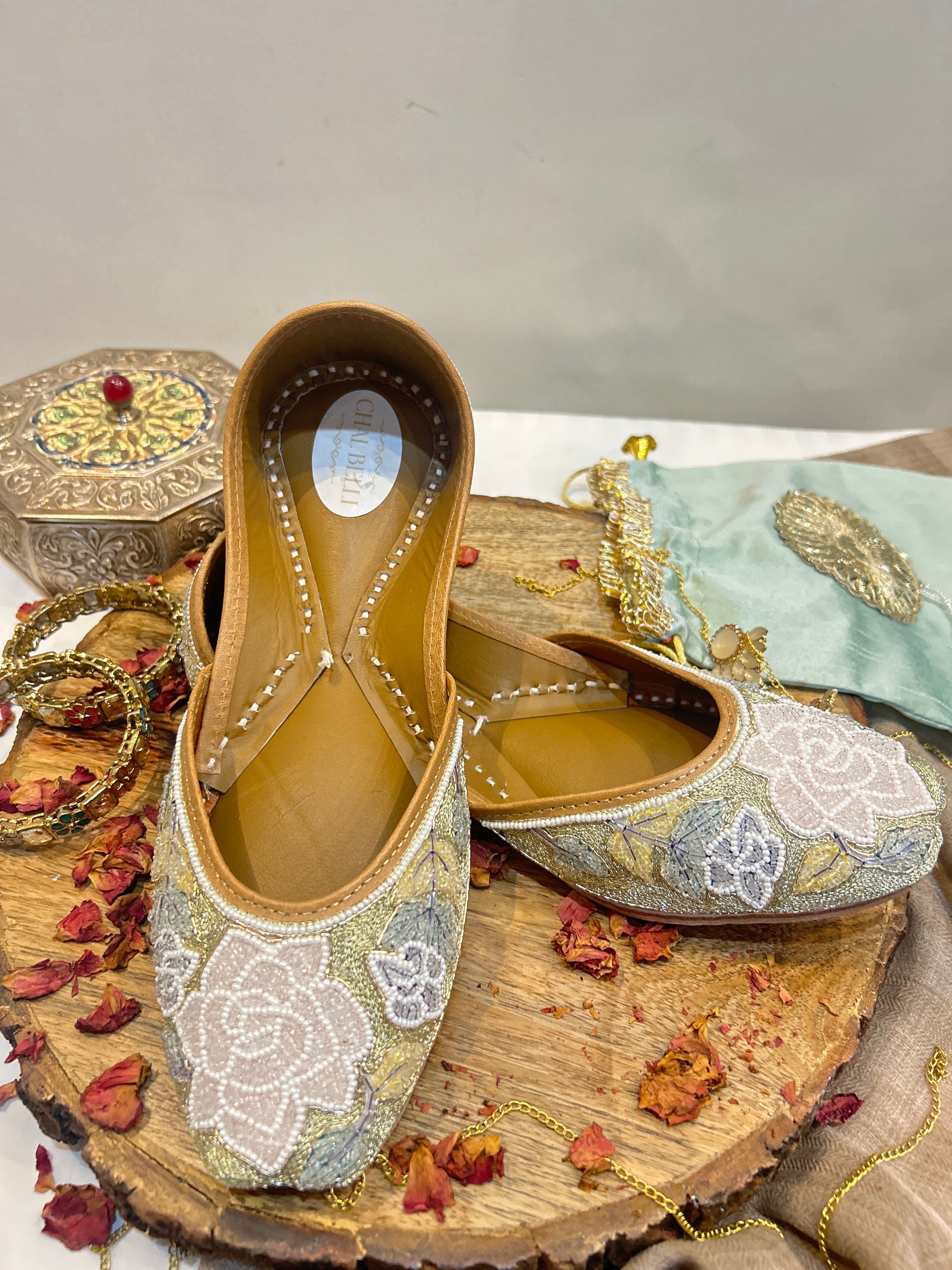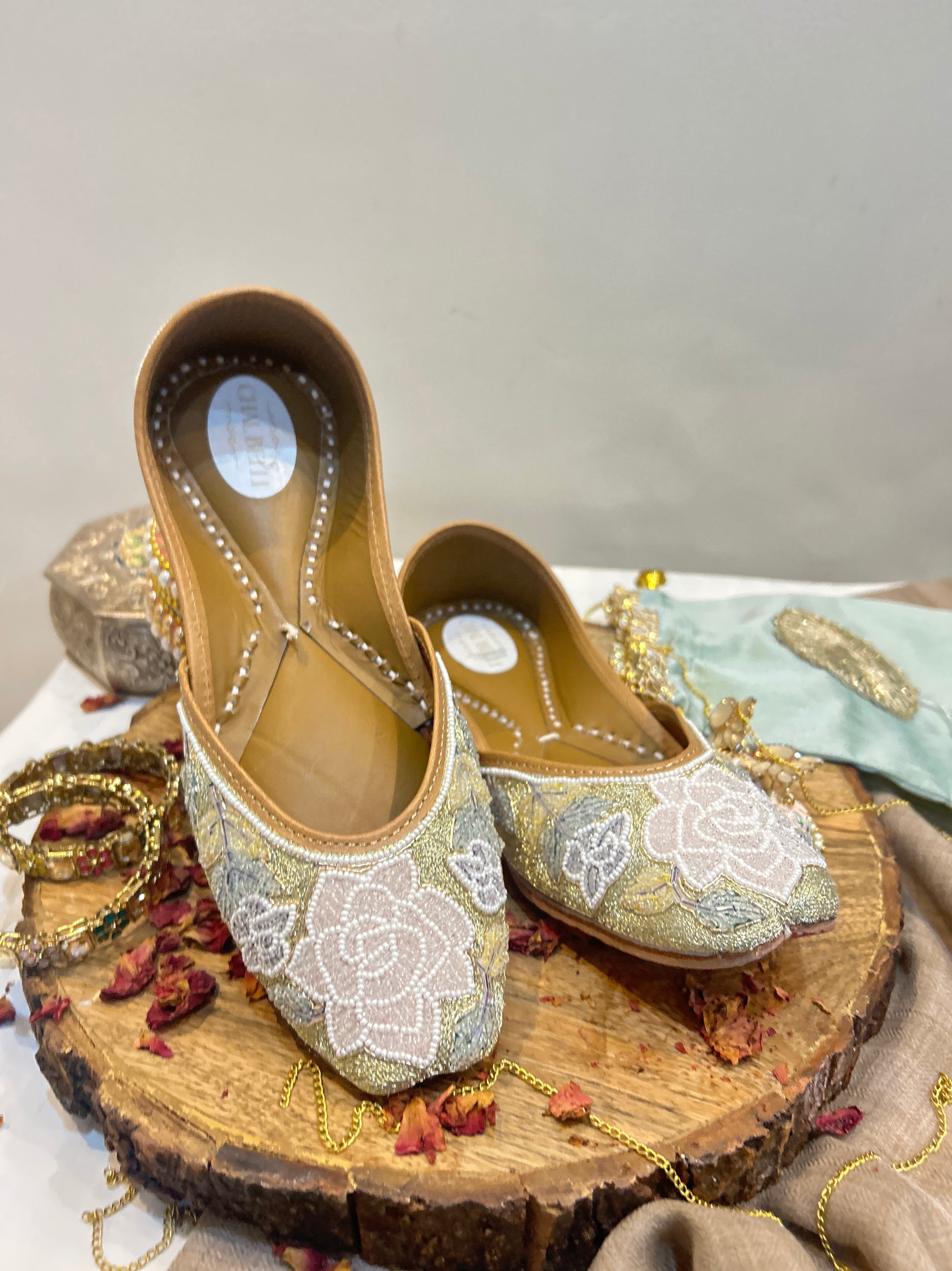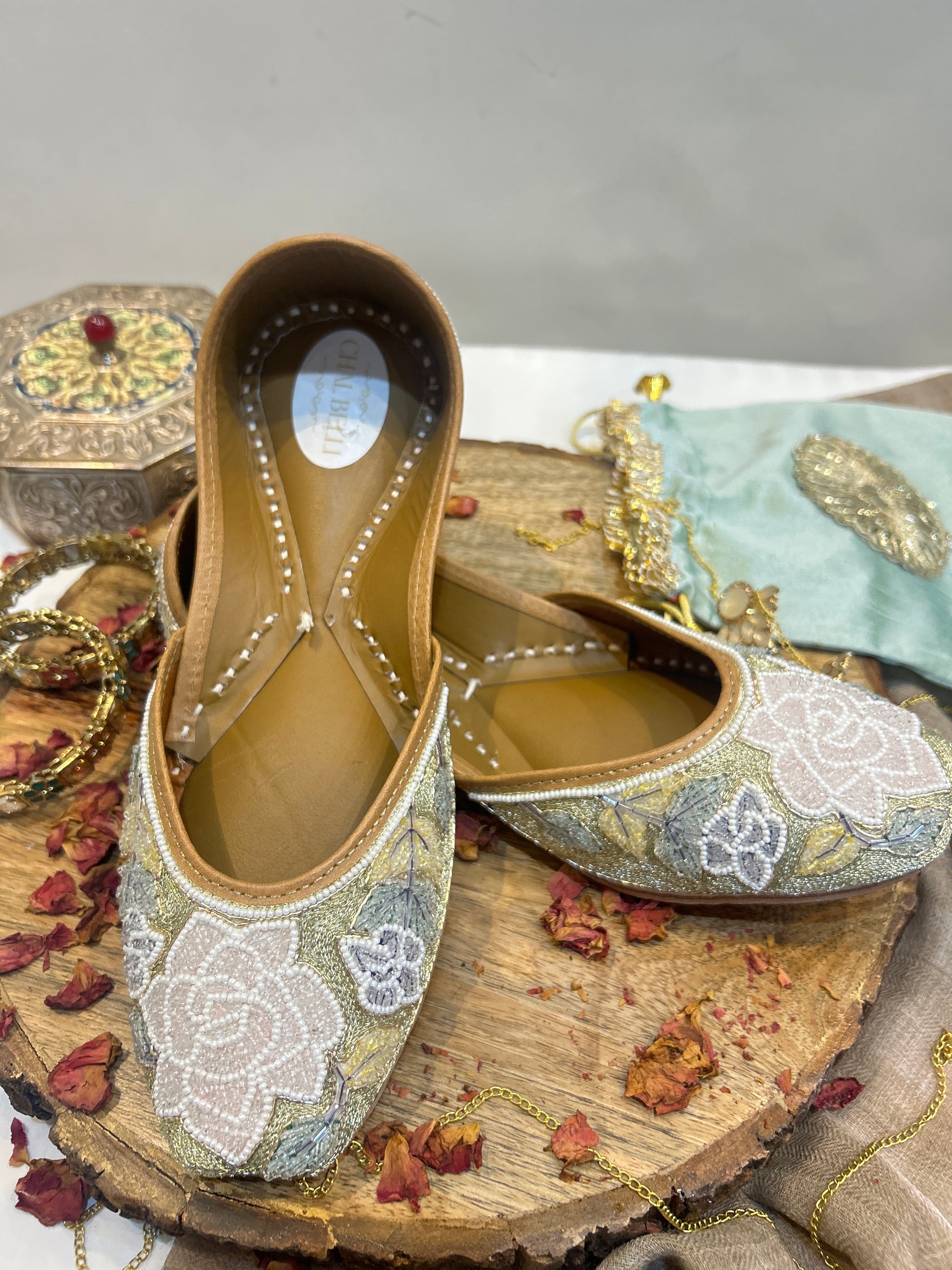 The Phool Pari jutti blooms with vibrant, multi-colored threadwork and petite florals over a pristine white satin base. This delicate design captures whimsical charm and offers true-to-size comfort.