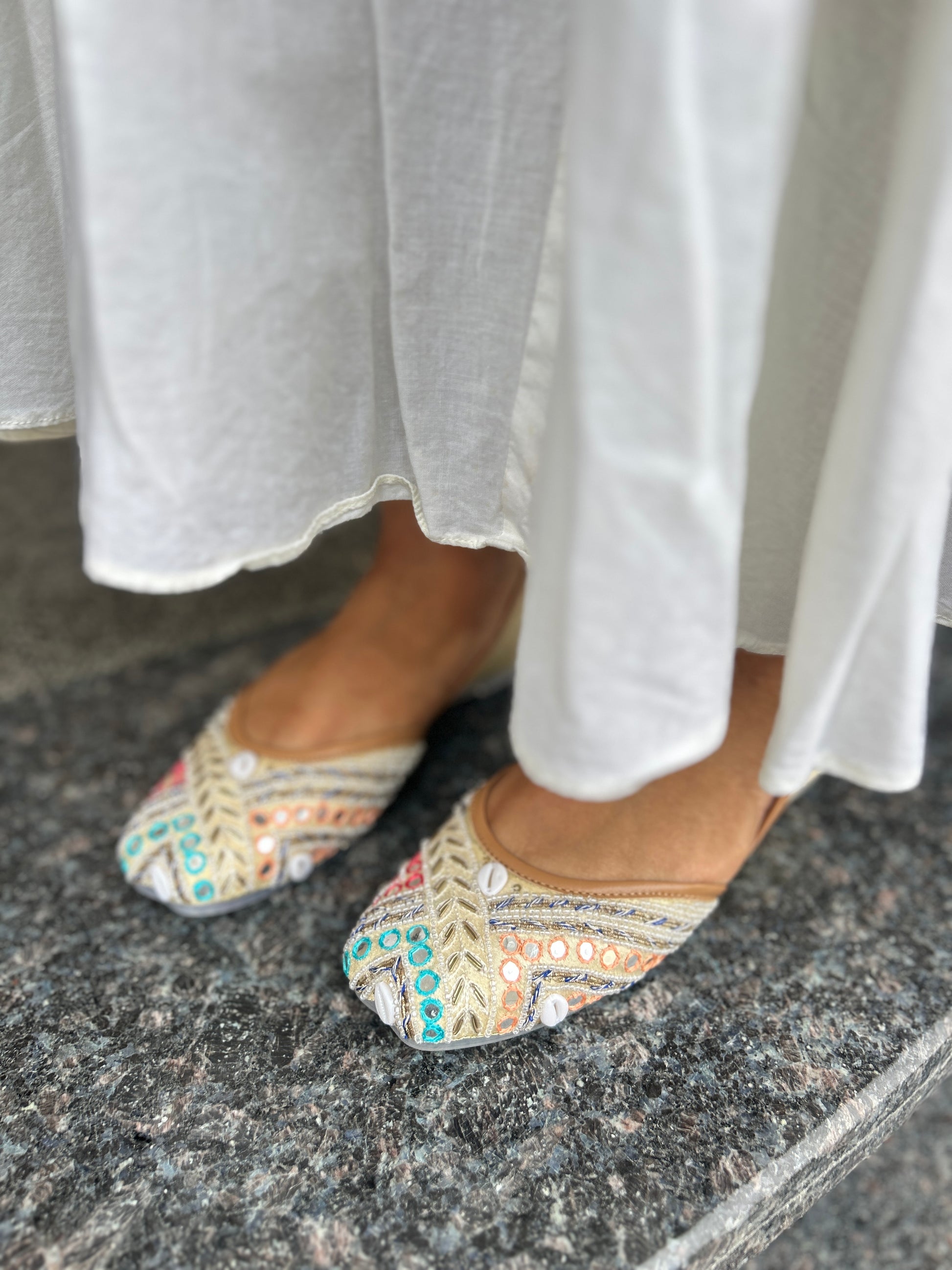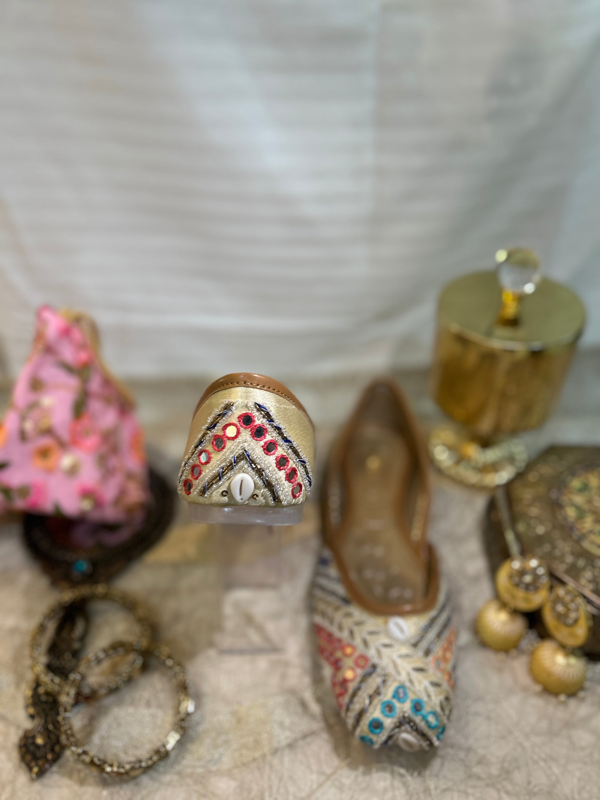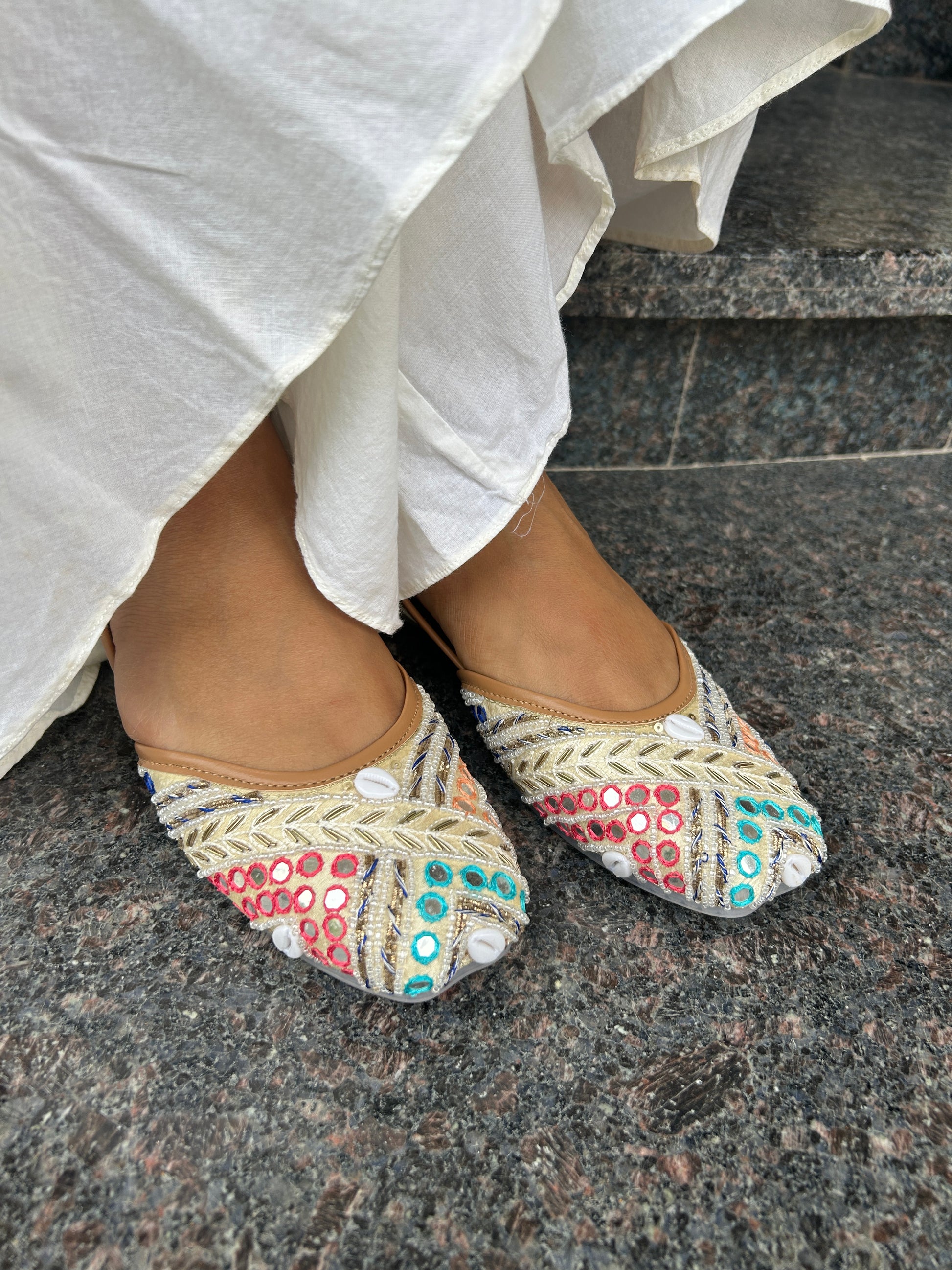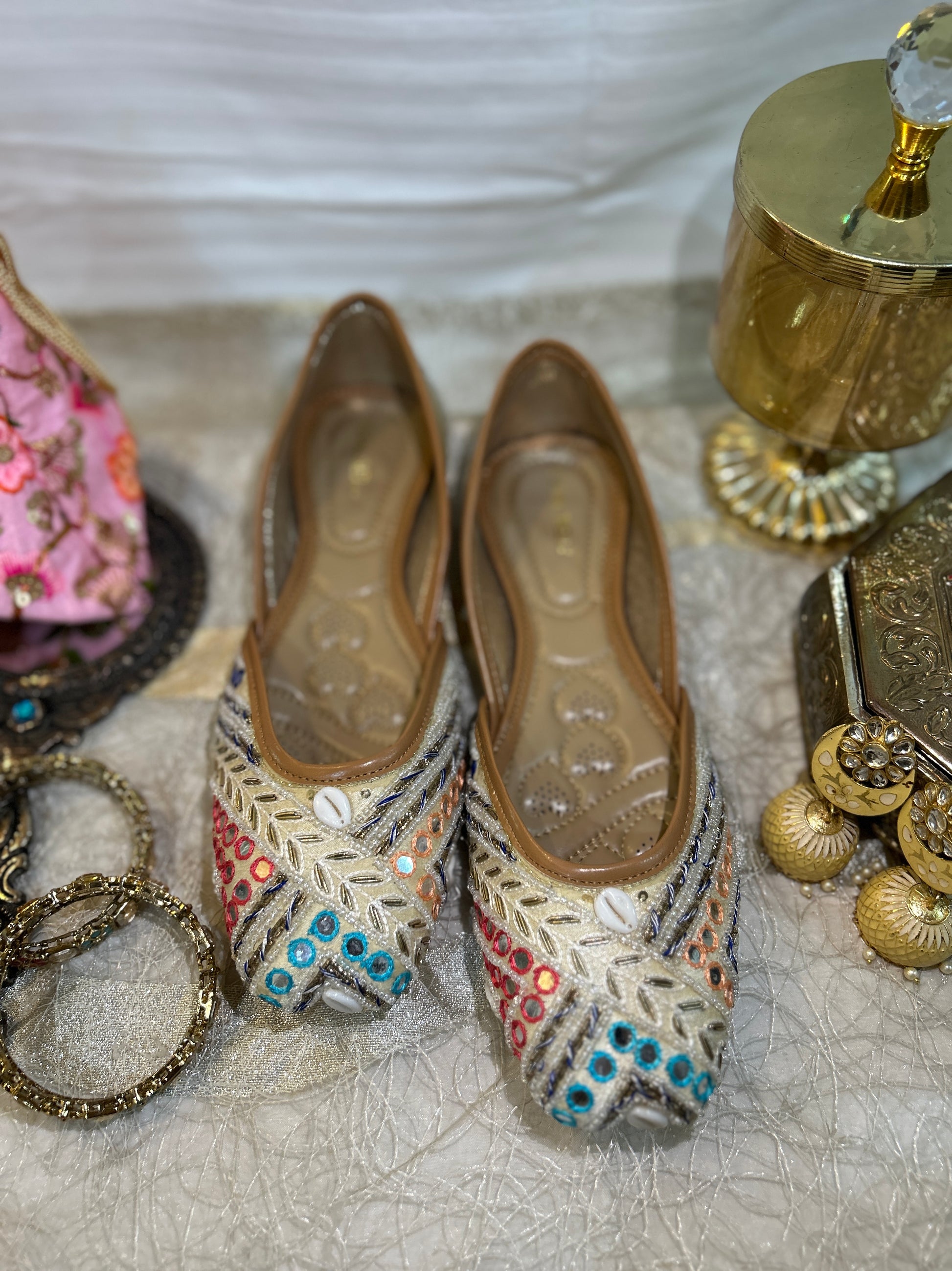 The Rang Leela jutti is pure celebration, featuring vibrant threads, mirror work, and cowrie shell accents on a light base. The bohemian, patchwork design is incredibly eye-catching, offering unique style and great comfort.