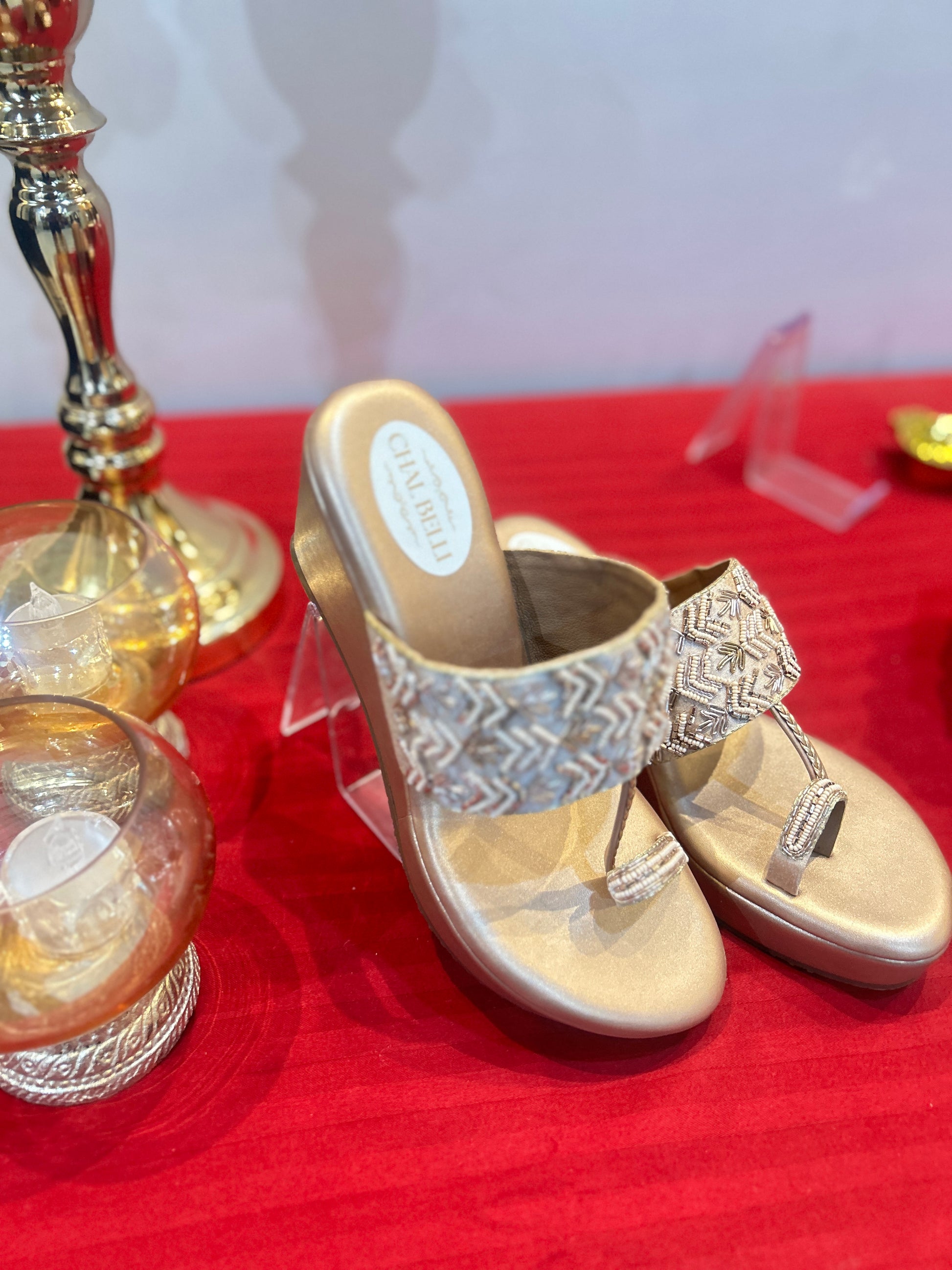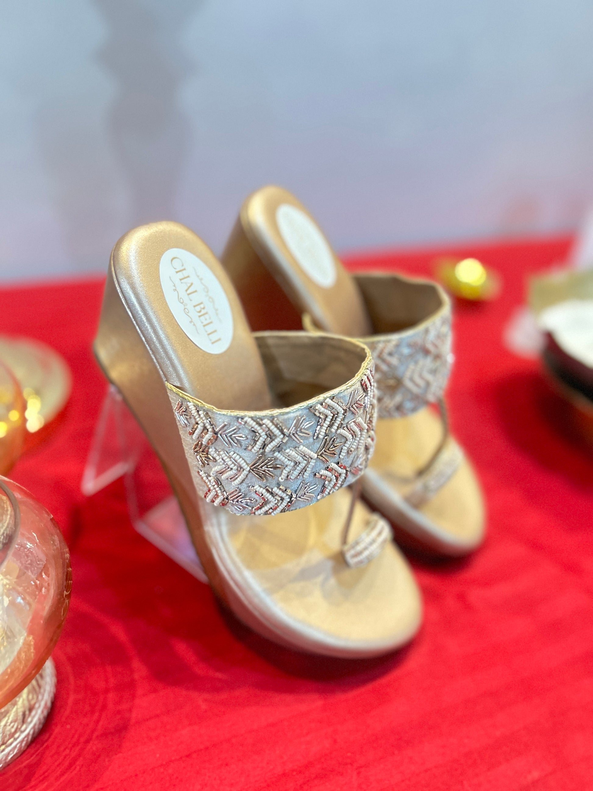 | Design | Scalloped Embellished Strap and Toe Ring on a Platform/Wedge Sole |