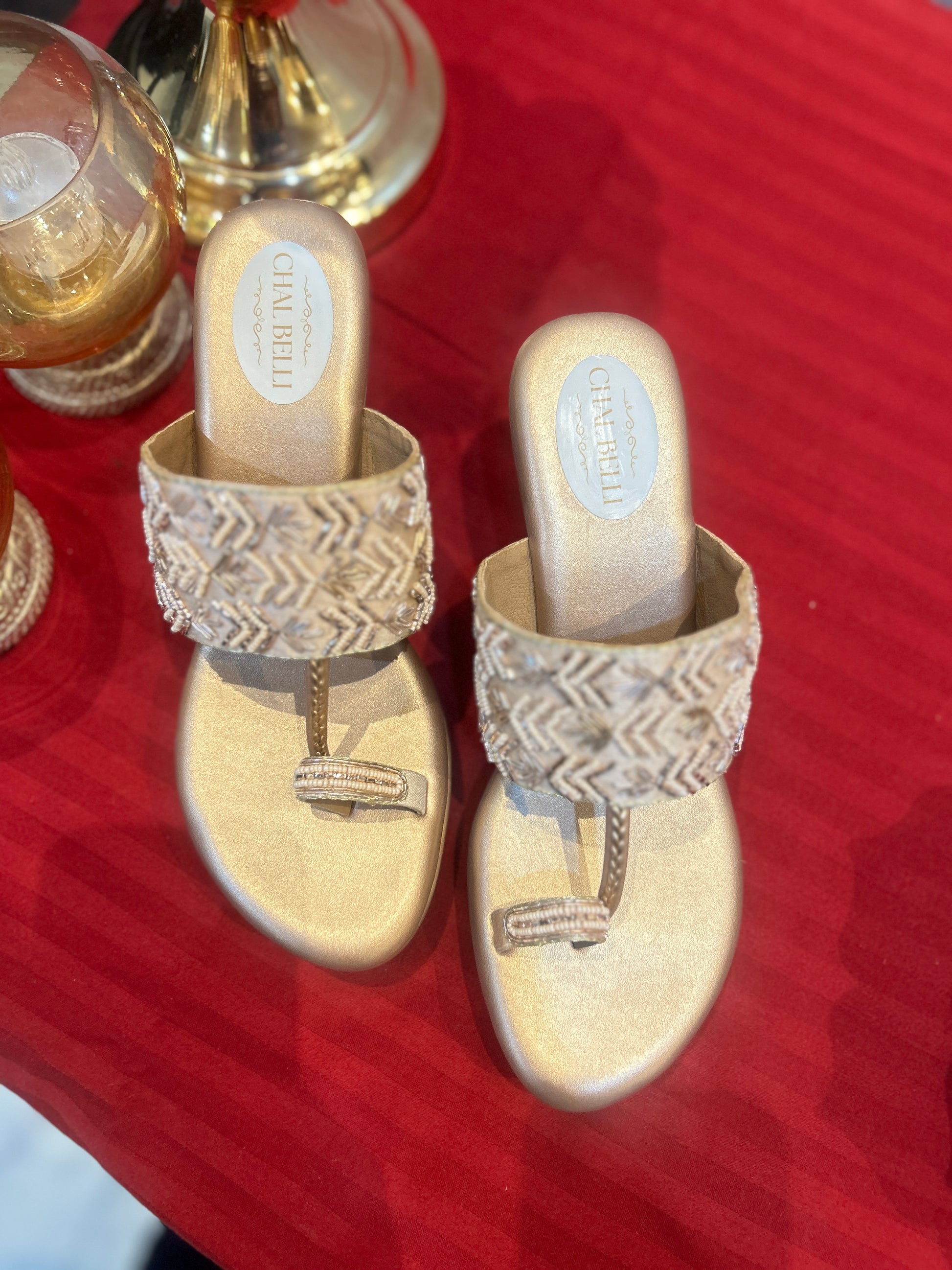The Rose Muse platform features a luxurious rose gold base with beautiful pearl and iridescent beadwork. This stylish sandal offers perfect height and all-day comfort.