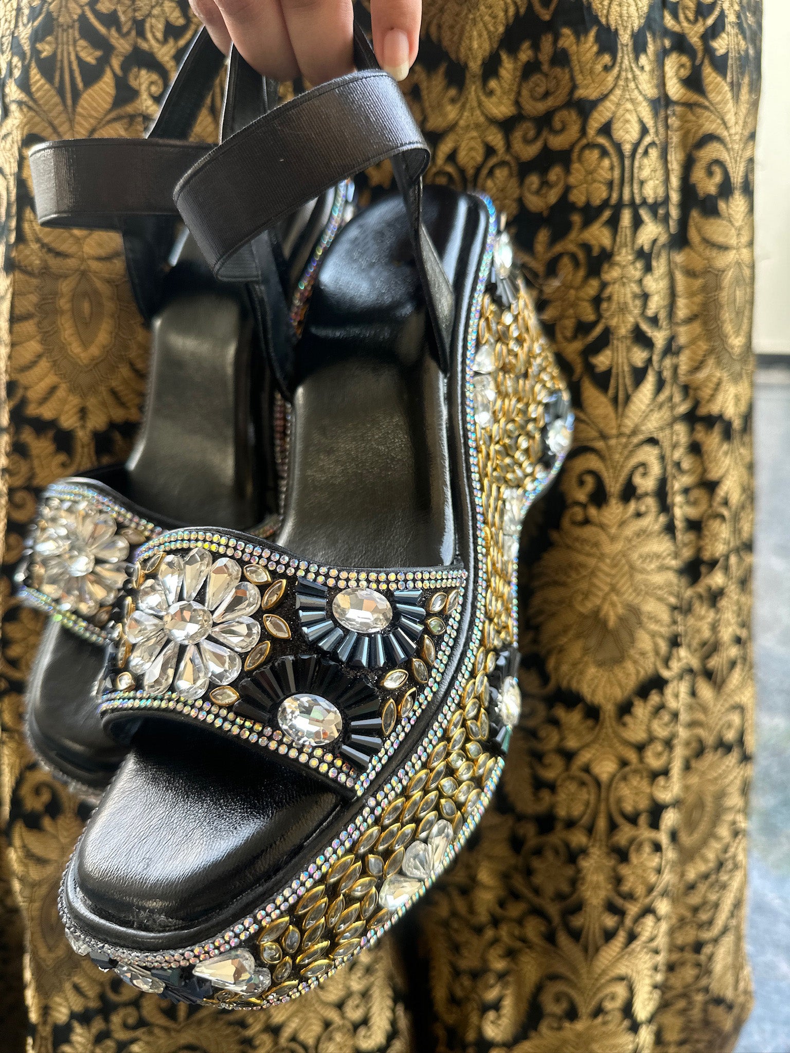 | Design | Open-Toe Design on a Sculpted Wedge Platform with Floral Crystal Clusters |