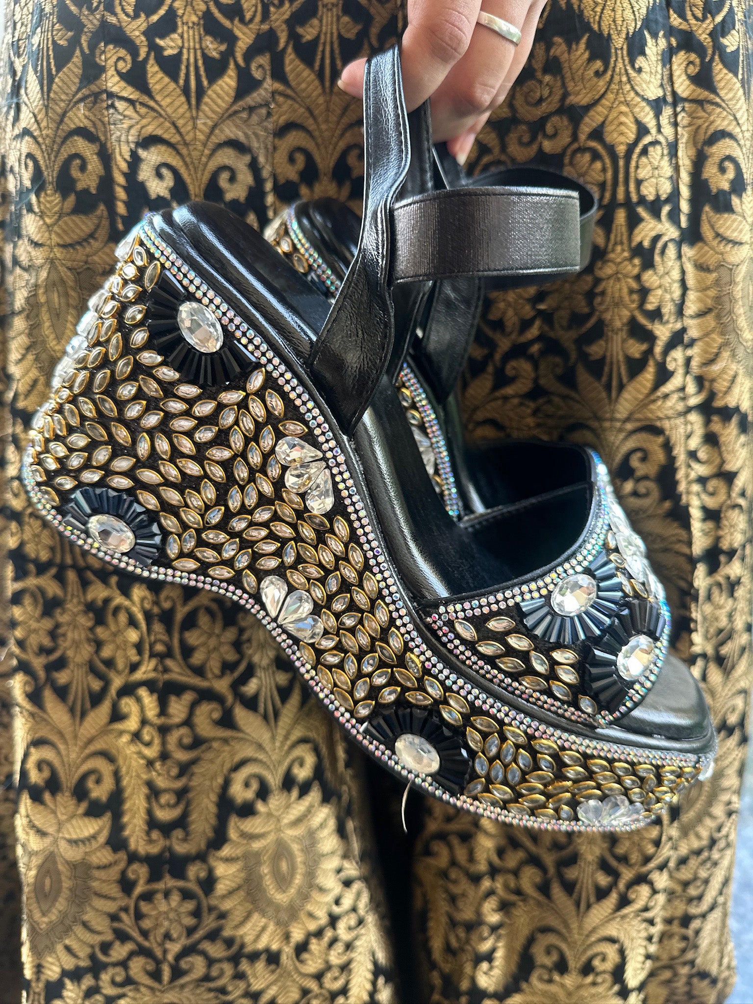 The Senorita sandal is pure extravagance, featuring a black base completely covered in multi-faceted crystals and gold accents. This maximalist wedge offers ultimate glamour and true-to-size comfort.