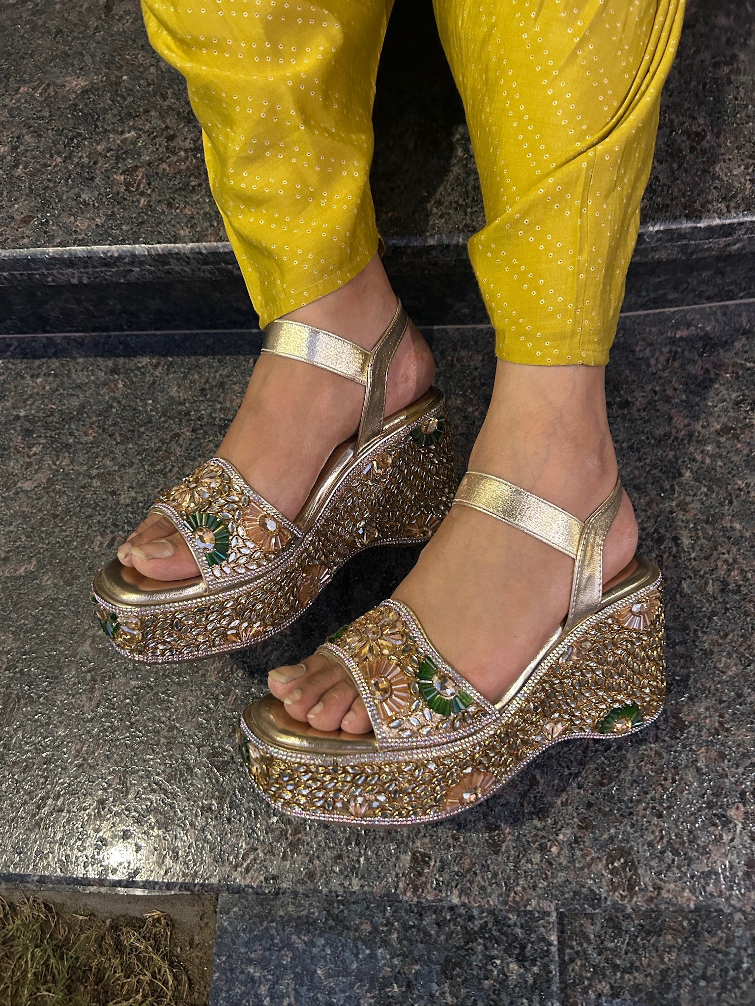 | Design | Open-Toe Design on a Sculpted Wedge Platform with Floral Crystal Clusters |
