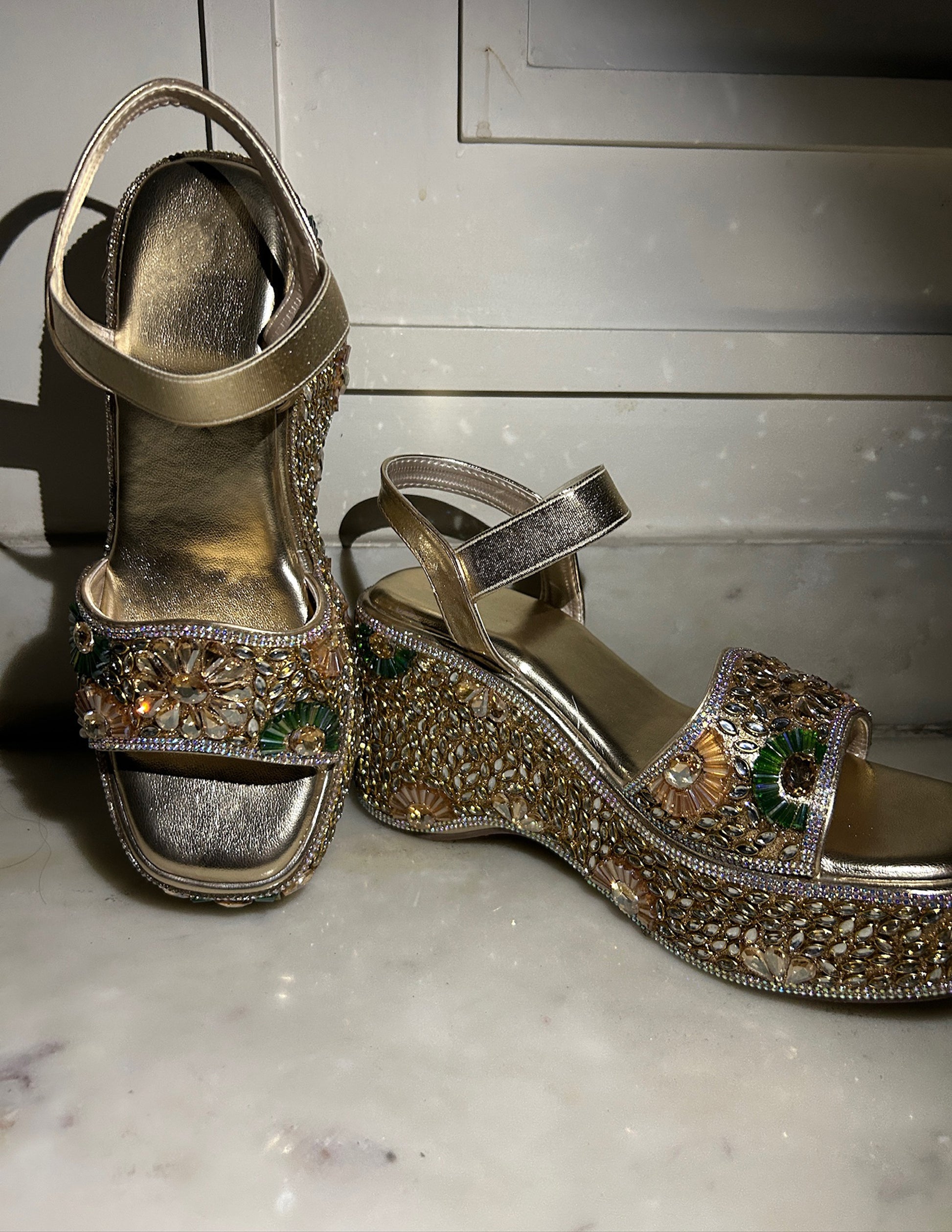 The Senorita sandal is pure extravagance, featuring a gold base adorned with intricate floral crystal clusters and shimmering green and gold beads. This maximalist wedge offers ultimate glamour and true-to-size comfort.