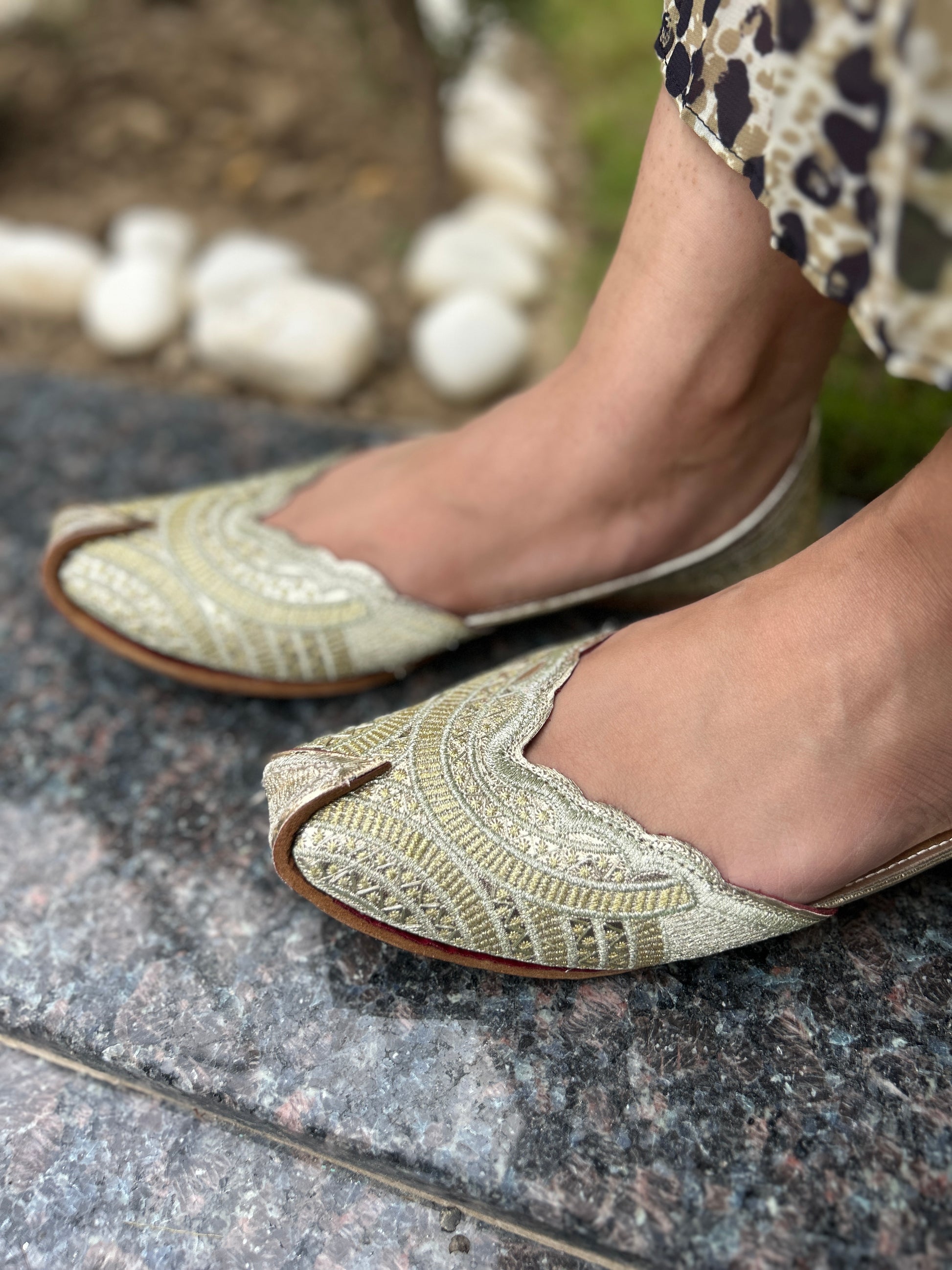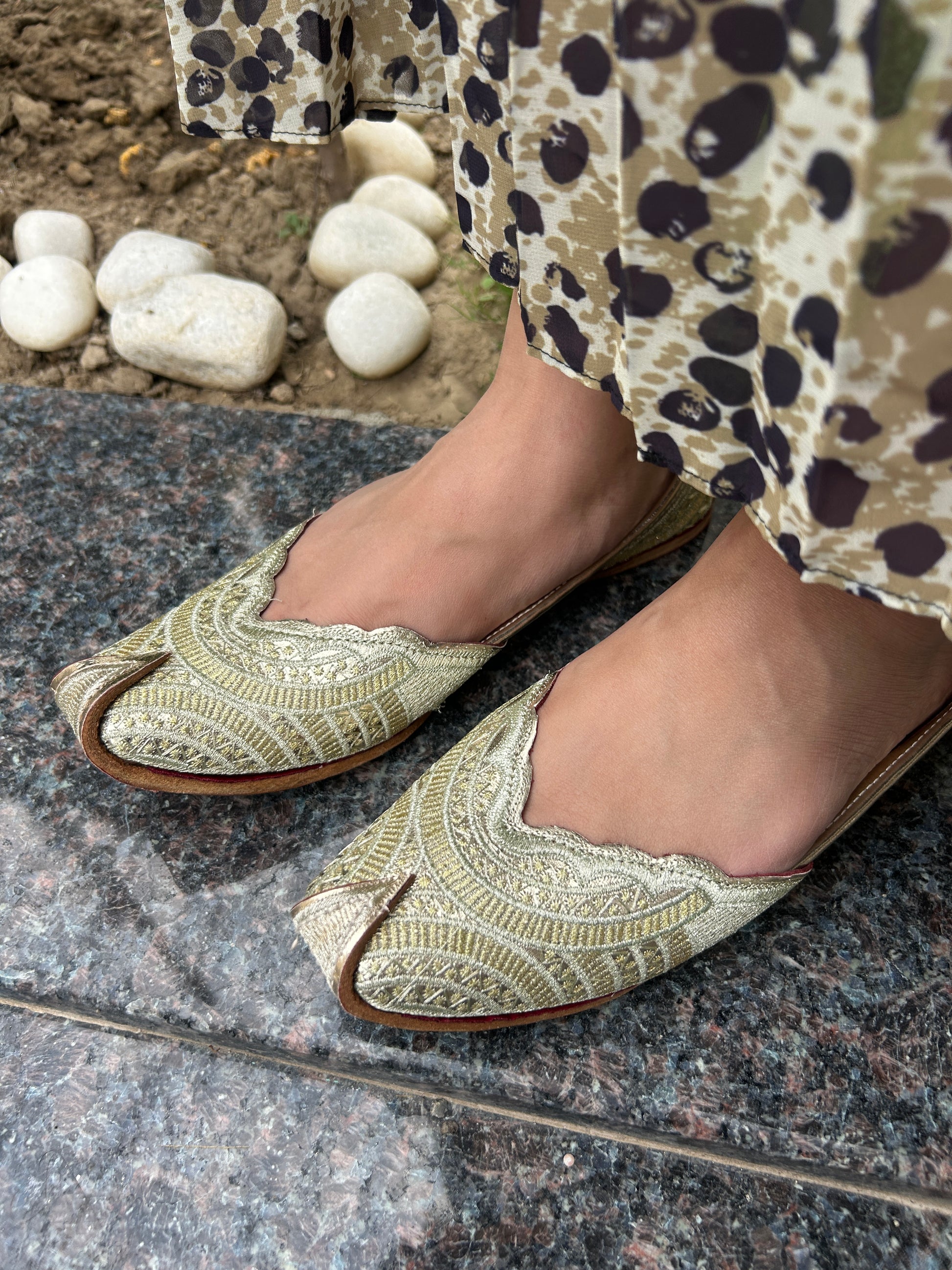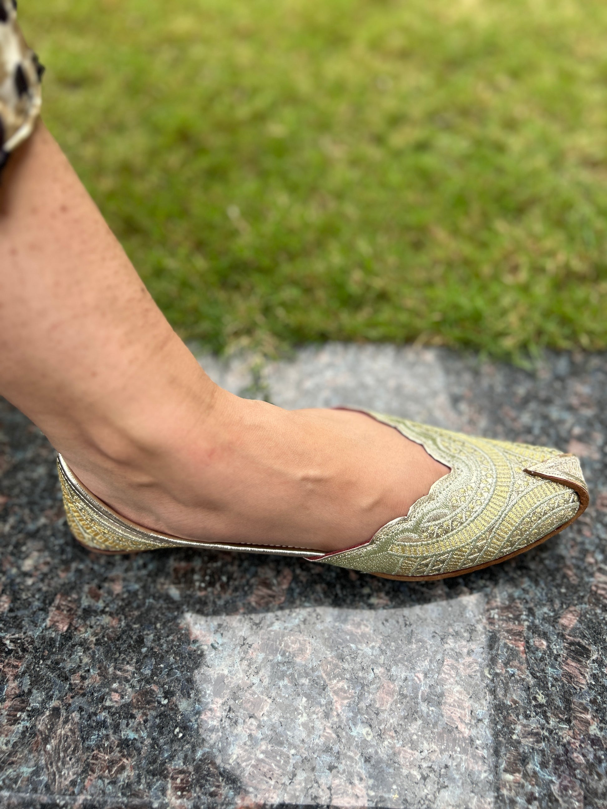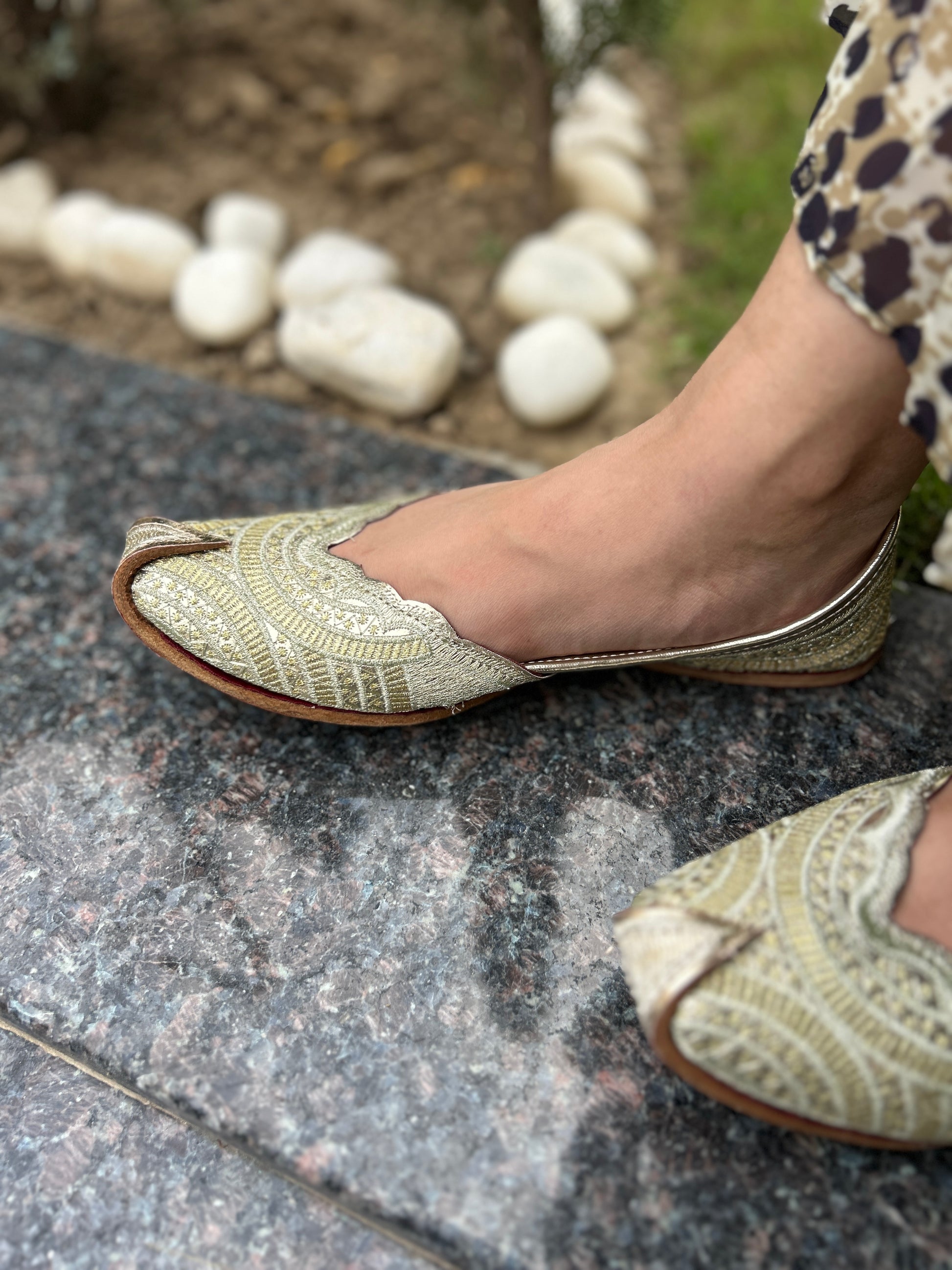 The Sethani jutti is pure prestige, featuring a rich, metallic gold base entirely covered in densely clustered golden sequins and beads. This opulent, regal design offers maximum glamour and great comfort for grand celebrations.