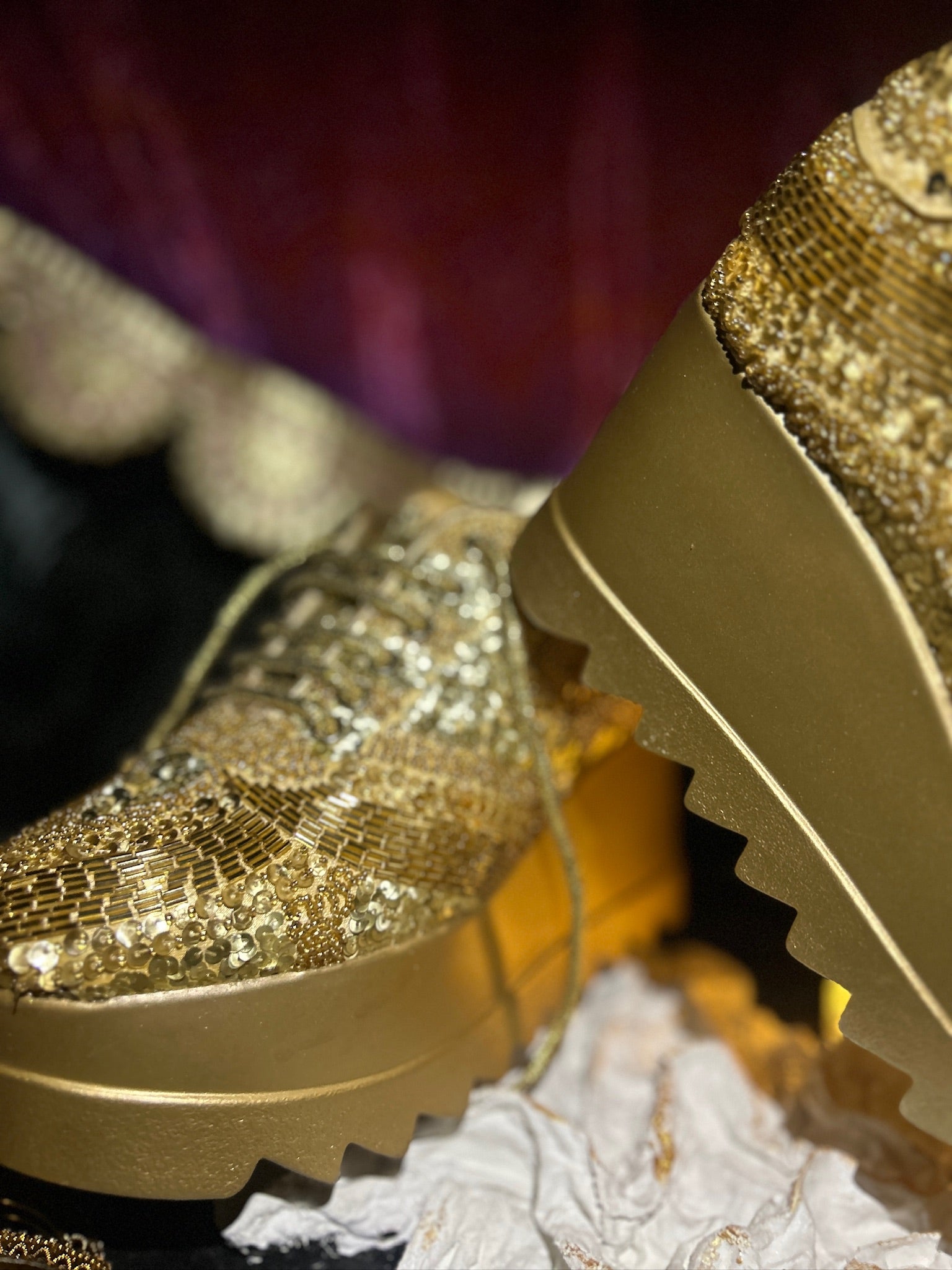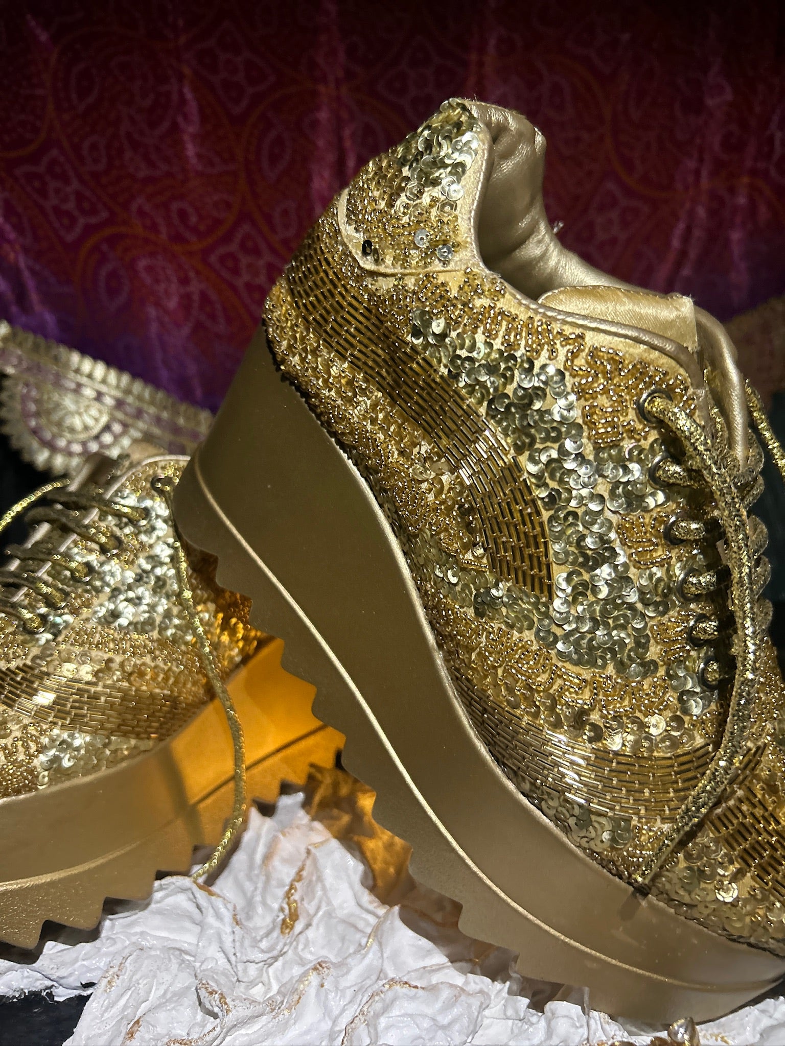 The Sitara sneaker is a wedding essential, featuring a dazzling all-gold sequin design on a bold platform sole. This eye-catching shoe provides effortless dance-floor comfort with maximum glamour.
