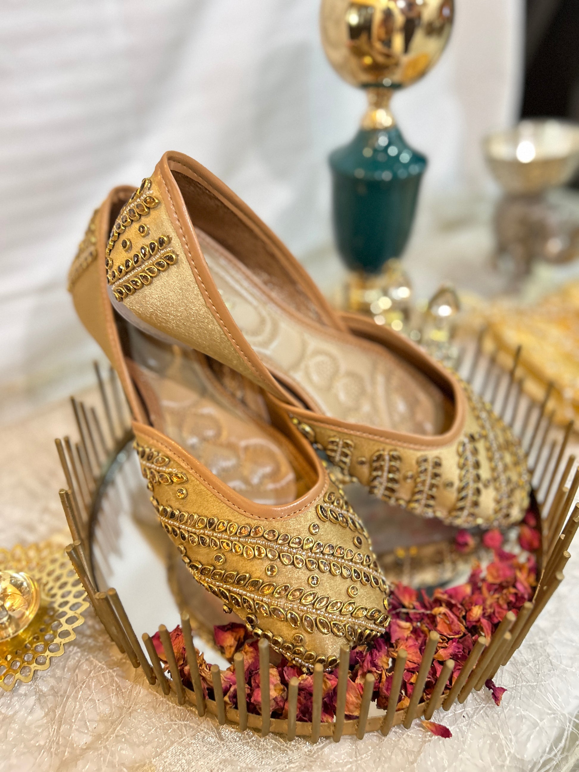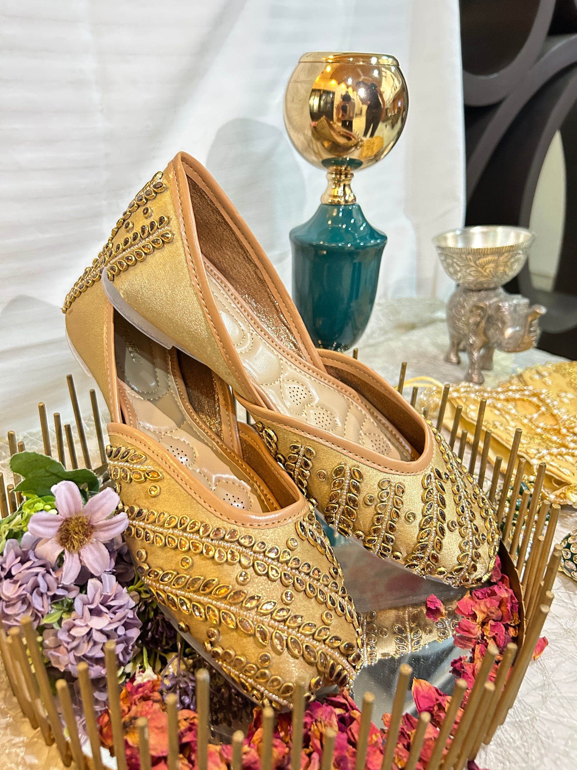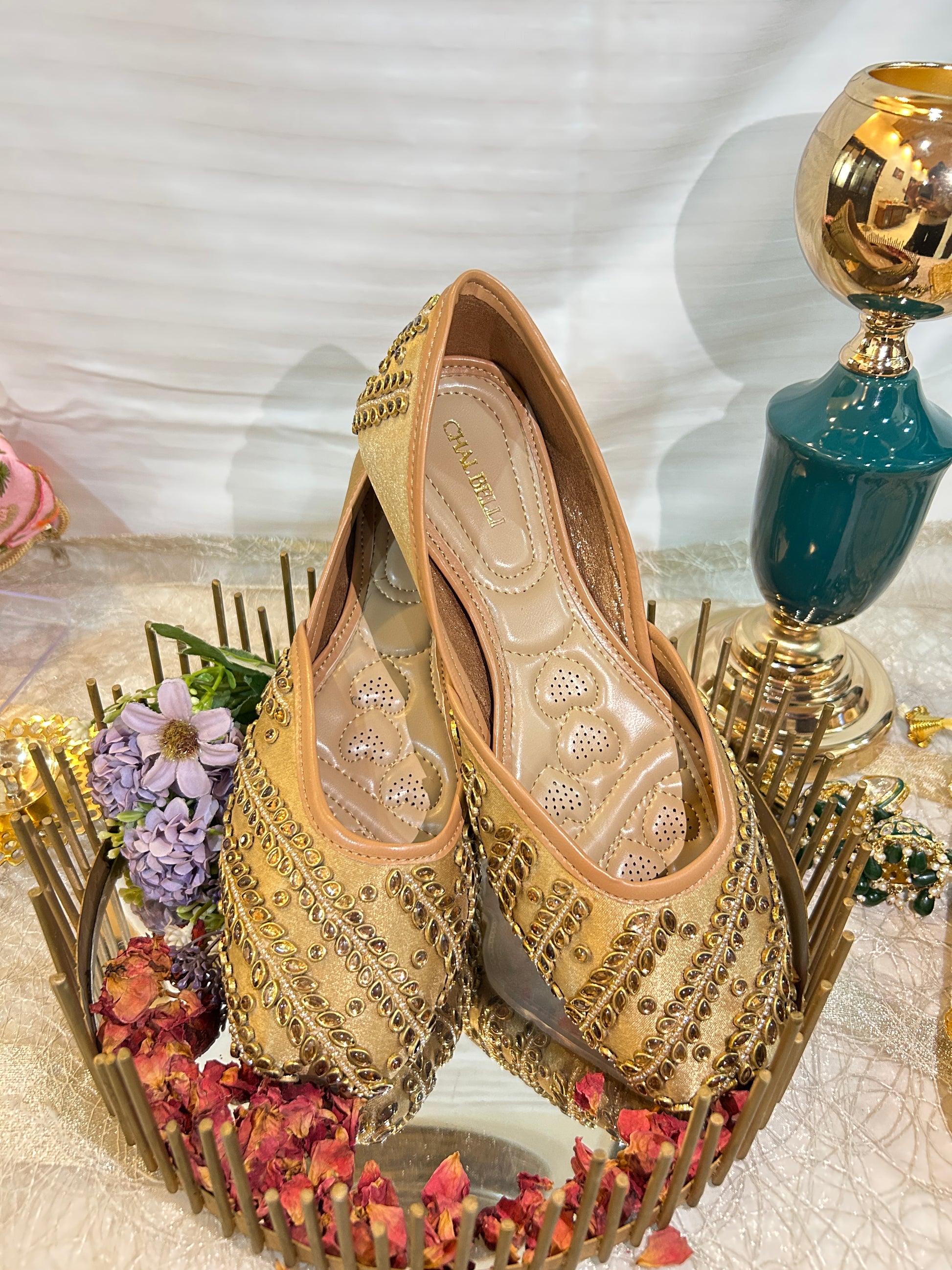 The Sonehri jutti is pure luxury, featuring a rich, solid gold base entirely covered in densely clustered gold beads and sequins. This bold, radiant design offers maximum glamour and great comfort for any grand event.