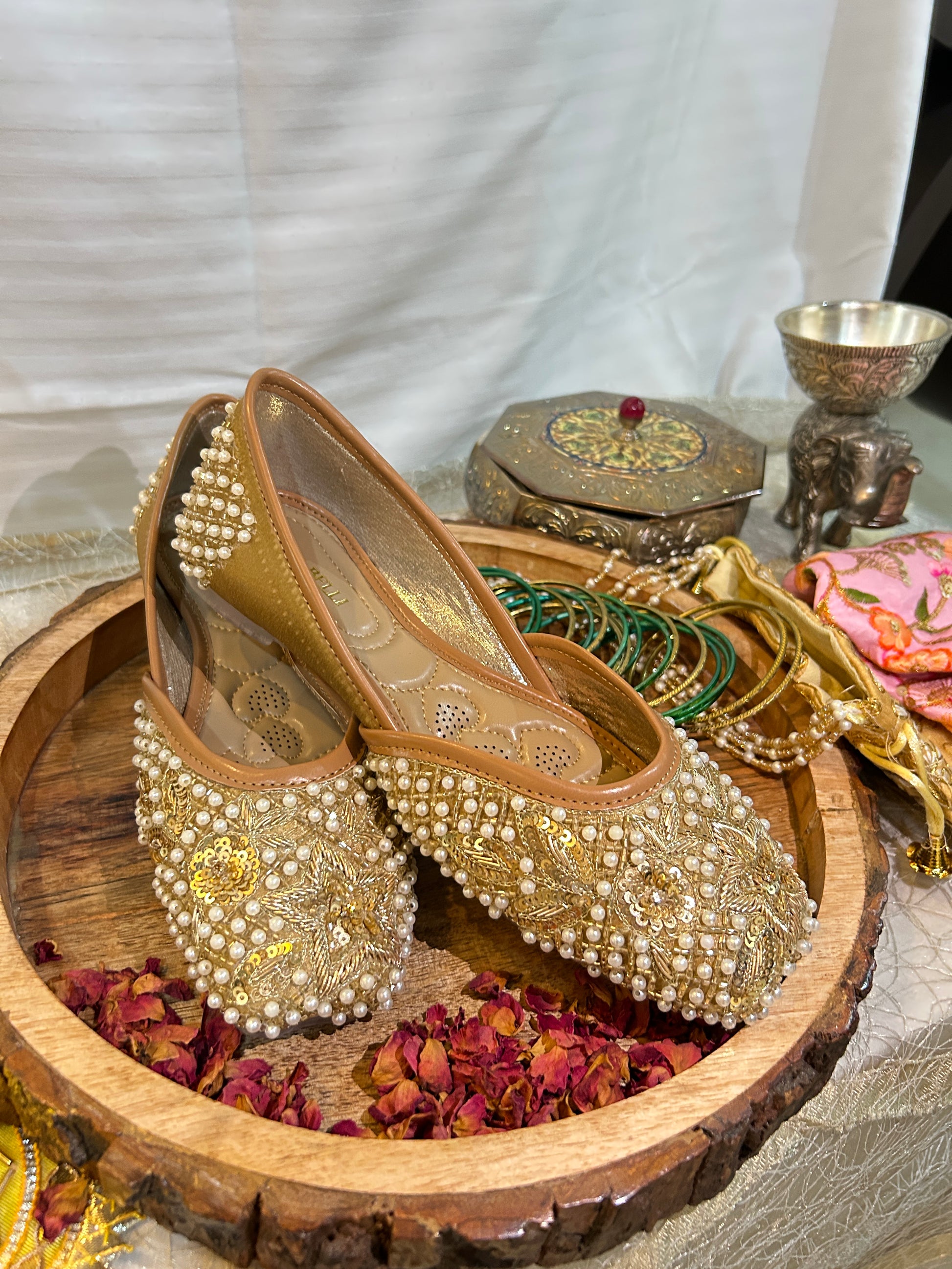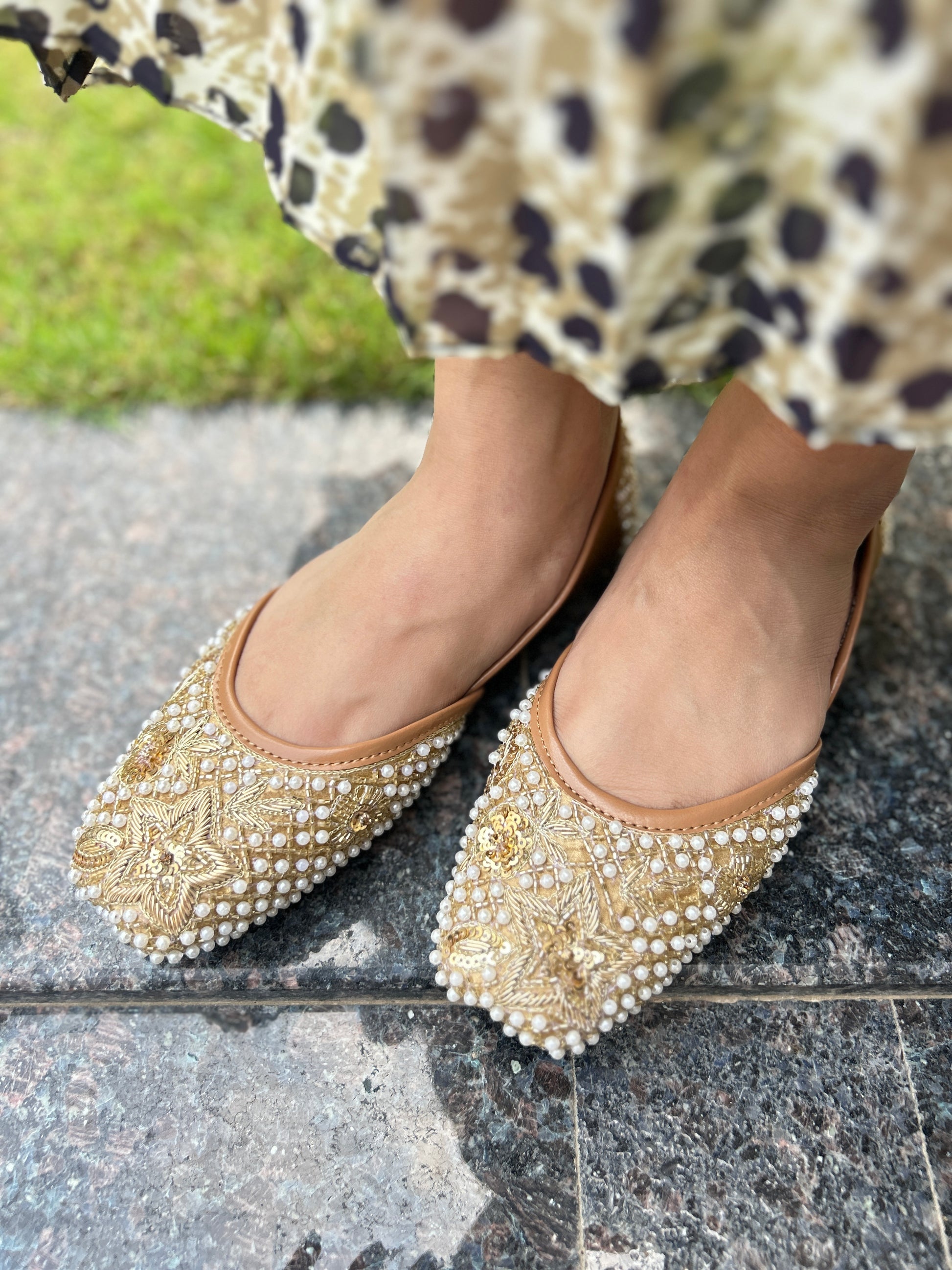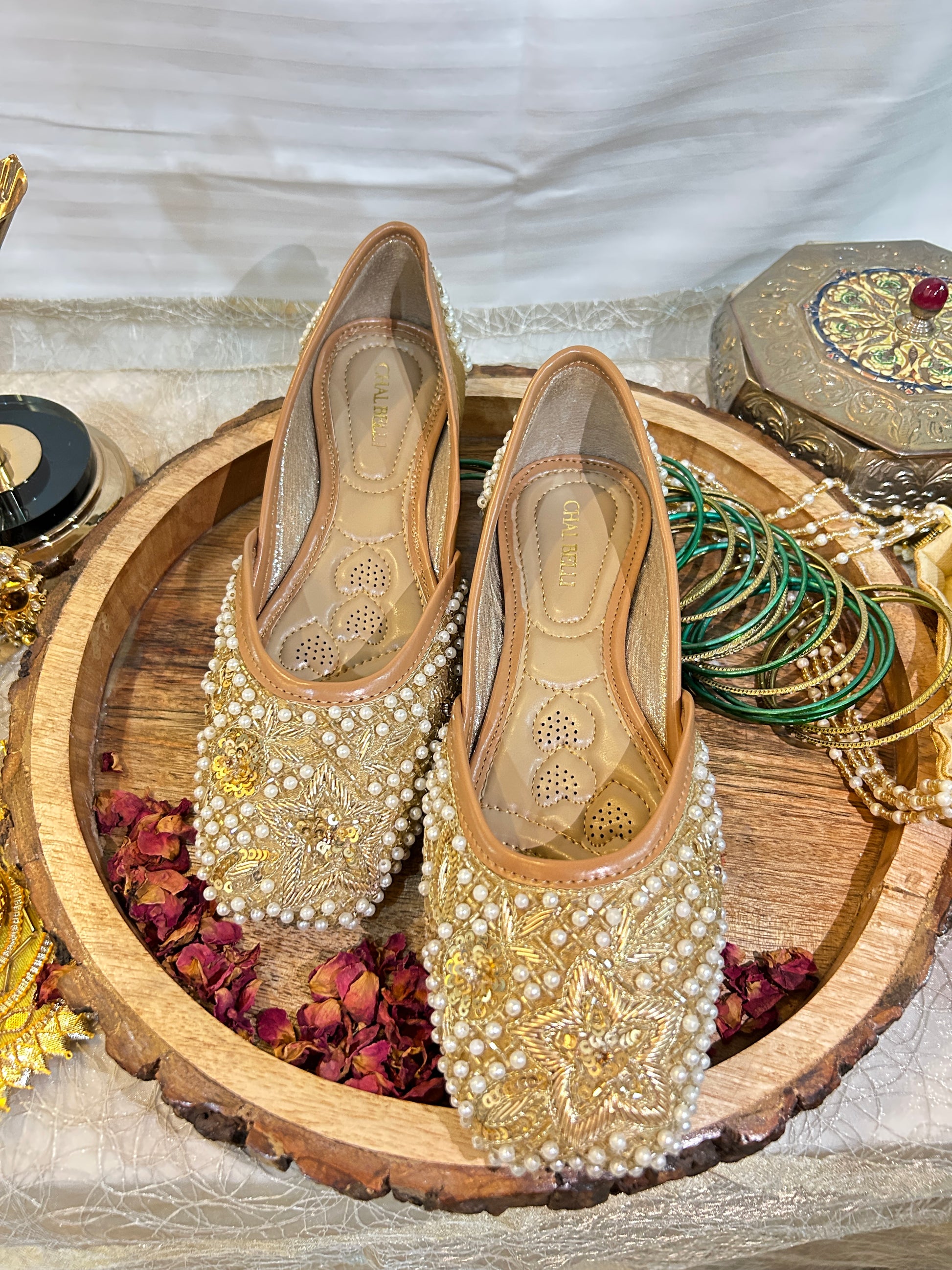 The Surya jutti radiates luxury with its rich gold base and prominent star motif, framed by a border of luminous pearls. This dazzling design ensures you shine brightly, offering great comfort for any grand event.